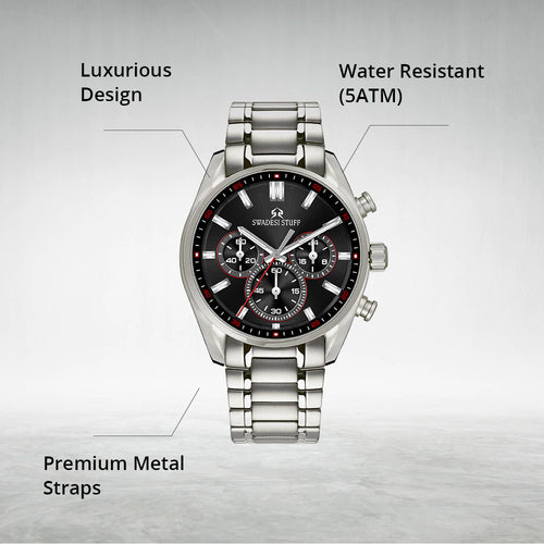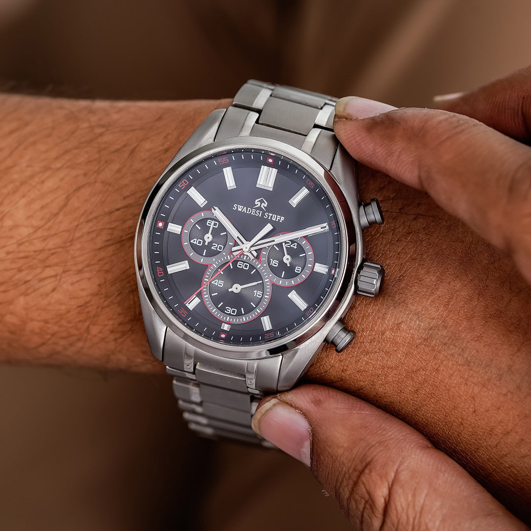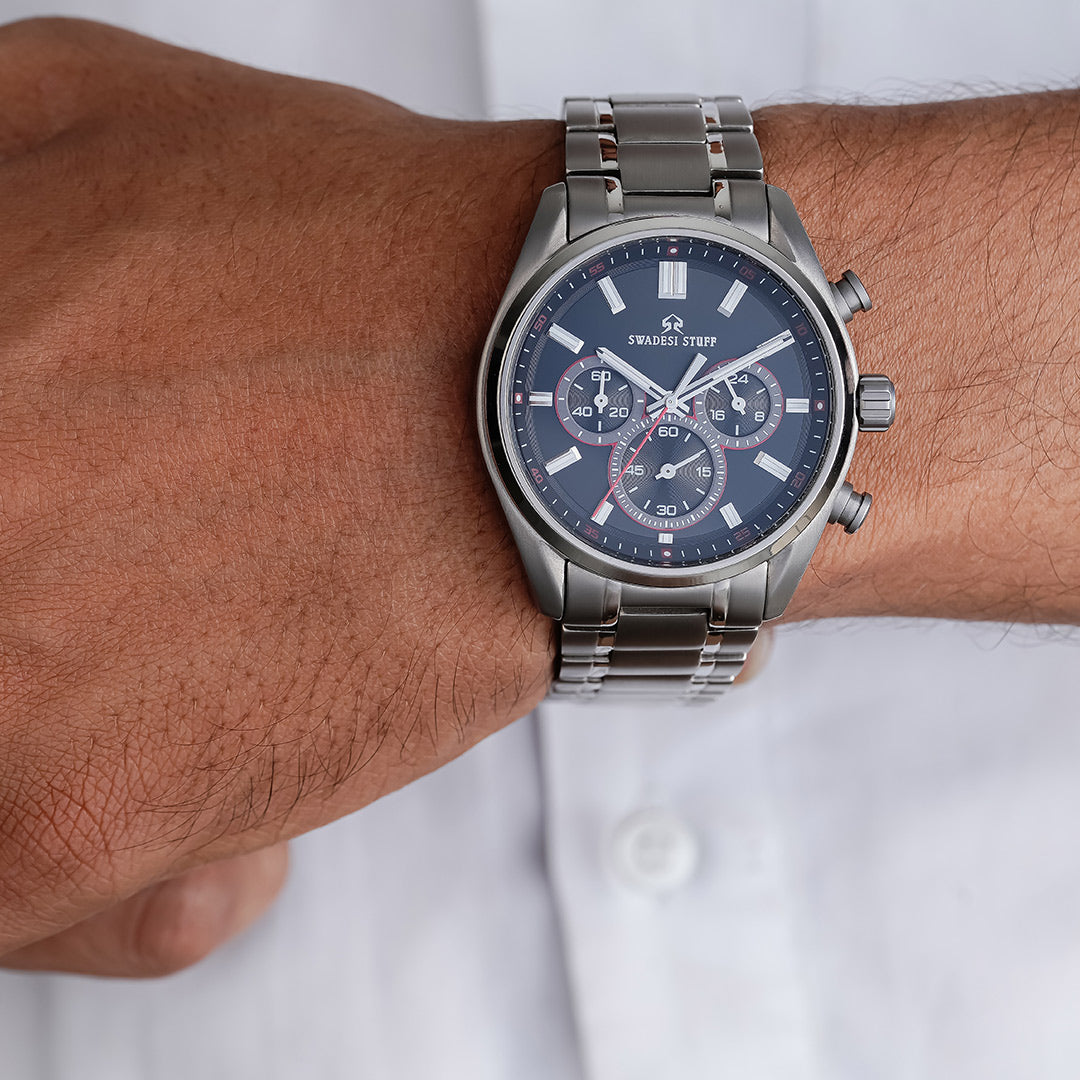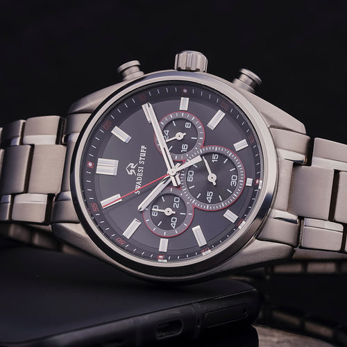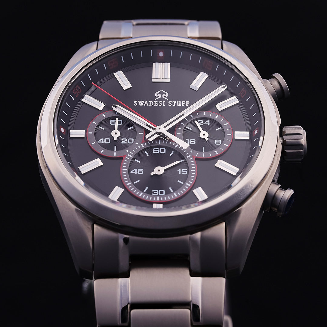 Aerodyne by Swadesi Stuff is a modern, hi-tech & luxurious timepiece. The premium watch is made using Titanium metal. The same metal that is used for making aircraft turbines, military aircrafts & space shuttles. The use of titanium metal makes this watch lighter in weight as compared to other steel watches but has the same sturdiness. The luxurious design paired with modern engineering makes the Aerodyne the perfect multi-occasion watch. Elegant on the wrist but bold enough to liaise the Swadesi sentiments.