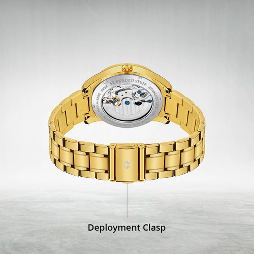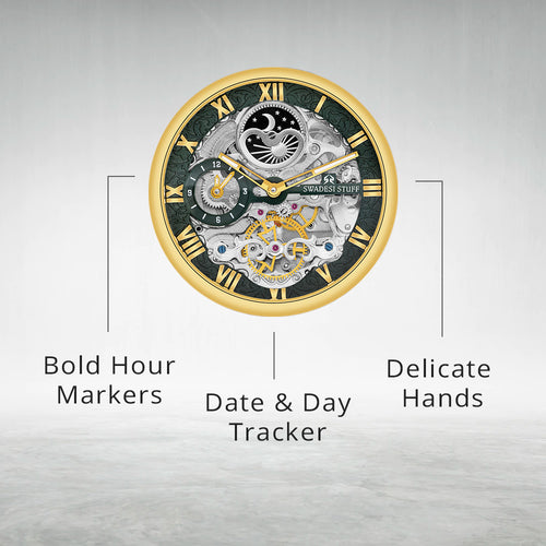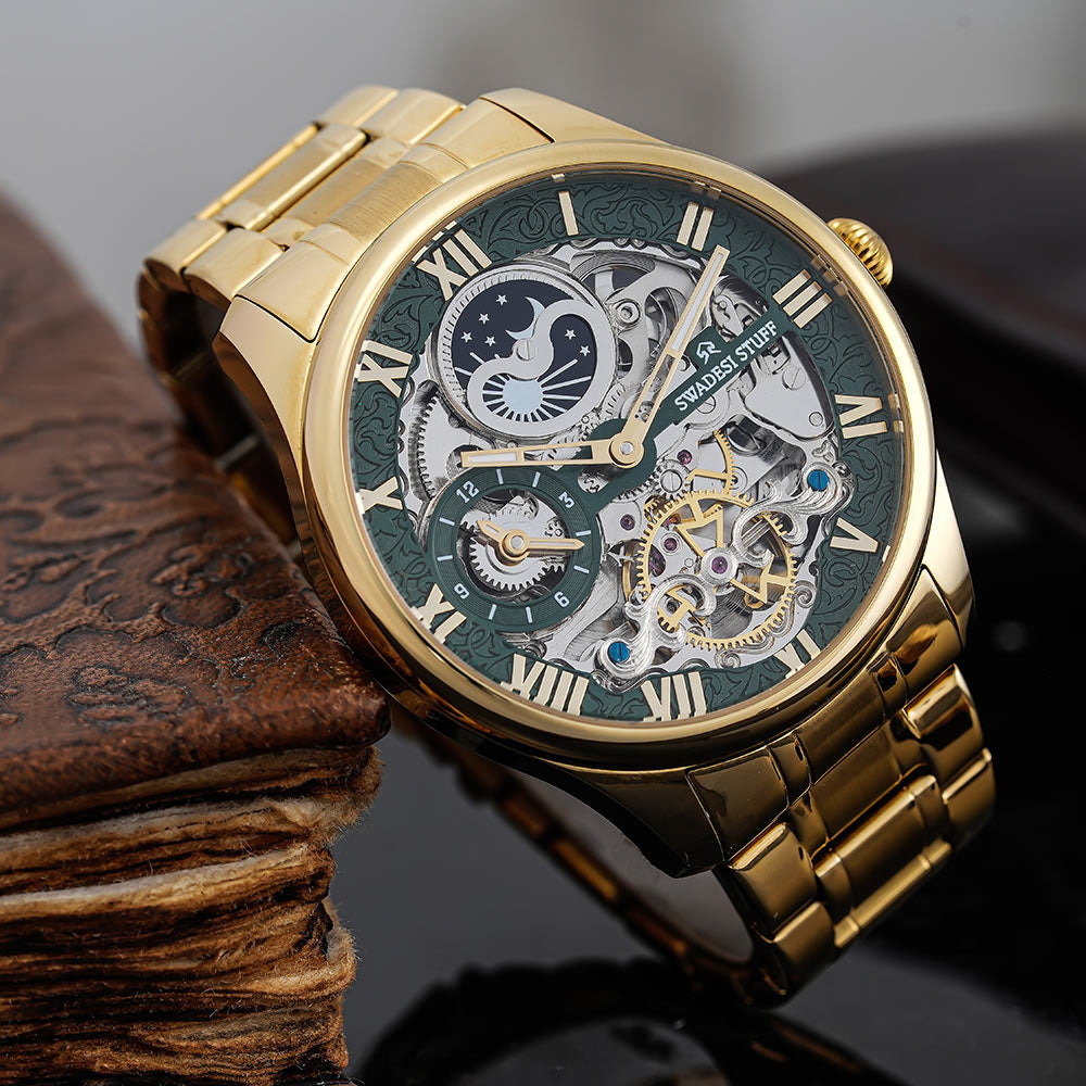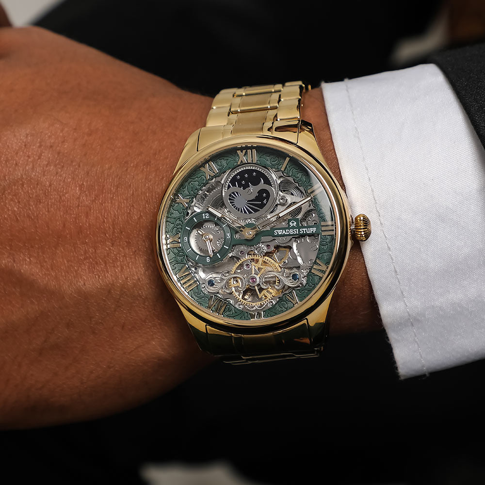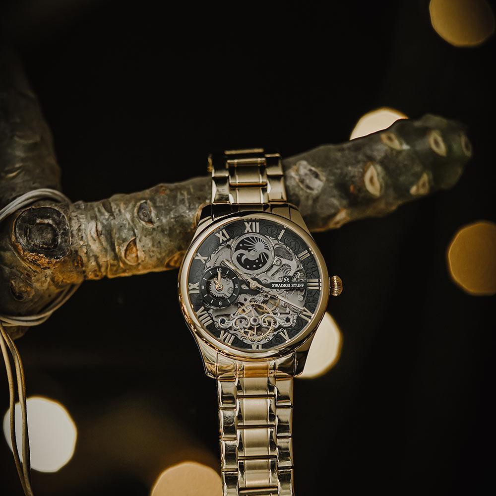Aristocracy by Swadesi Stuff is a master creation & a vintage beyond valuation. Crafted by the finest Indian artisans, the luxurious, automatic timepiece is surely a collectors item. The watch fluants a skelleton dial to add more to the premiumness & is held by a pair of sturdy metal straps. The movement technology used powers itself based on the hand movements you make. The masterpiece offers 5 years of movement warranty & 2 years of watch warranty. The eye-catching design of the watch feels elegant on the wrist & is bold enough to liaise the Swadesi Sentiments.