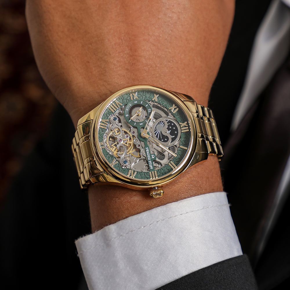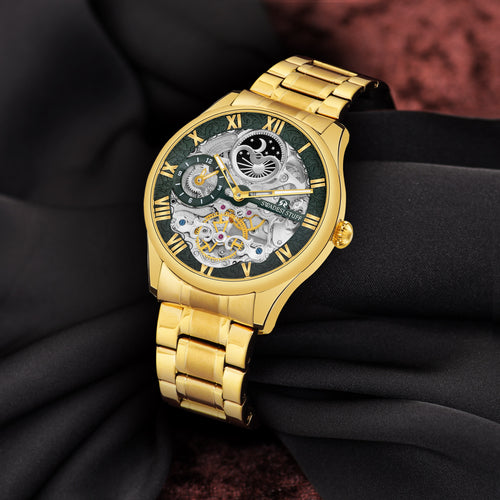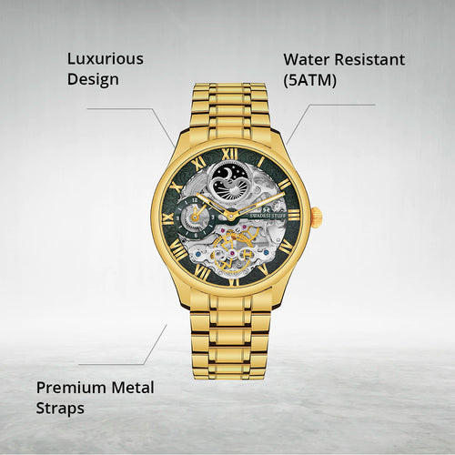 A luxurious watch with Automatic Movement, round face & skelleton dial with bold hour markers and delicate hands.