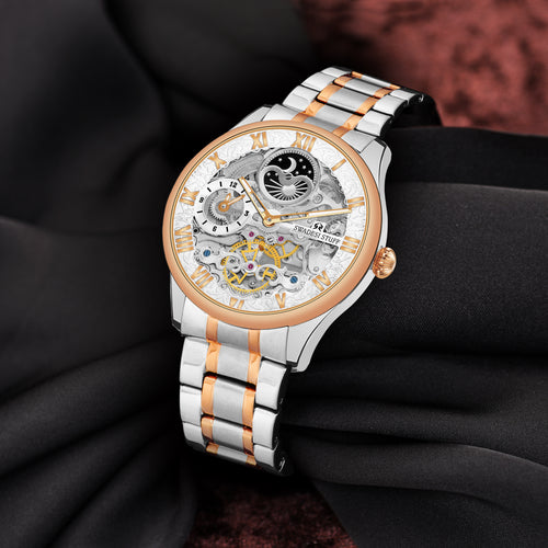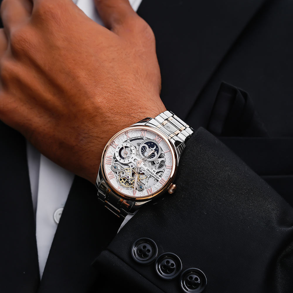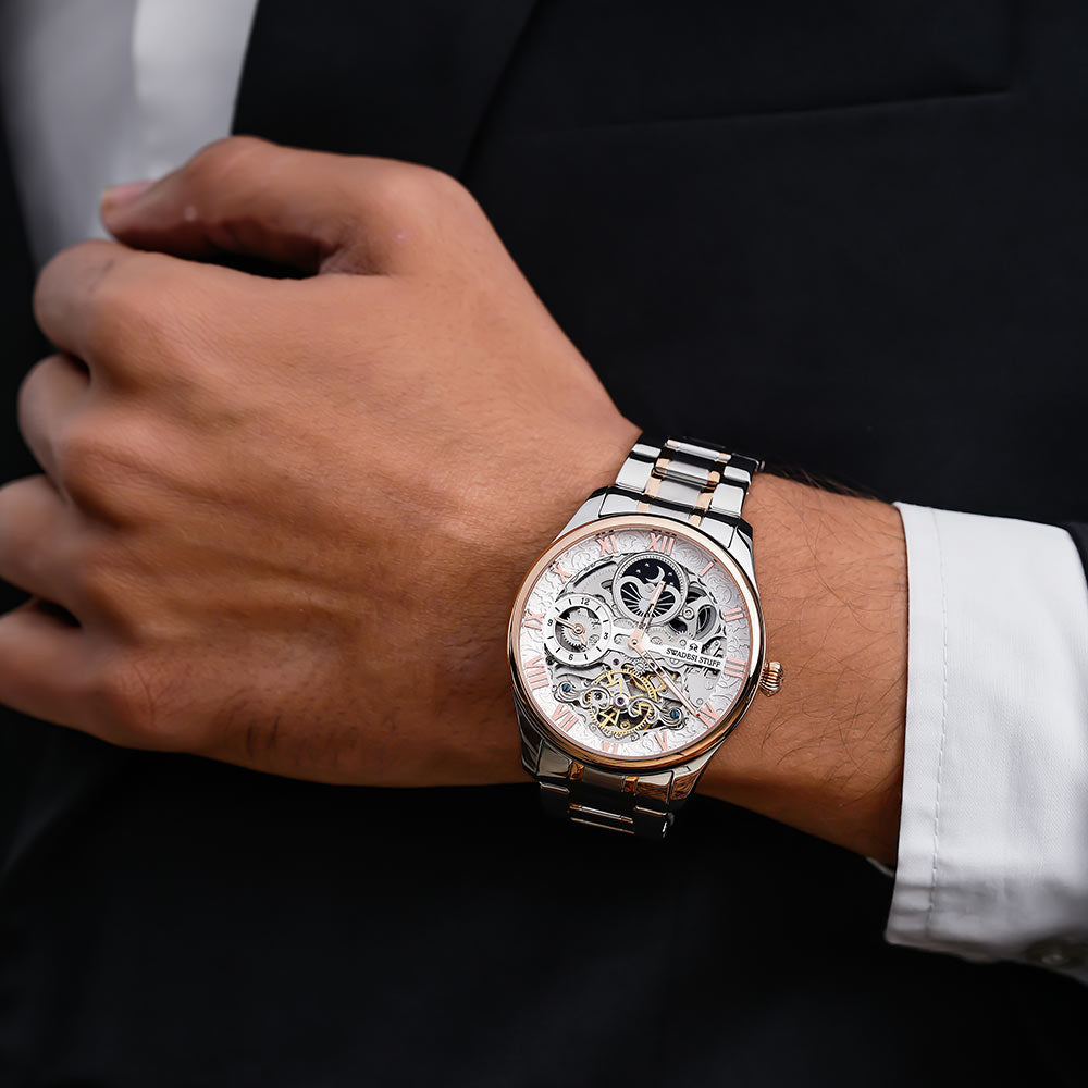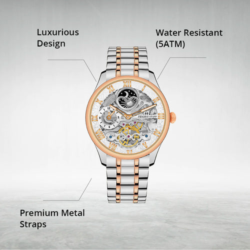 A luxurious watch with Automatic Movement, round face & skelleton dial with bold hour markers and delicate hands.