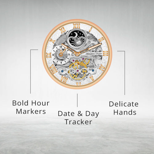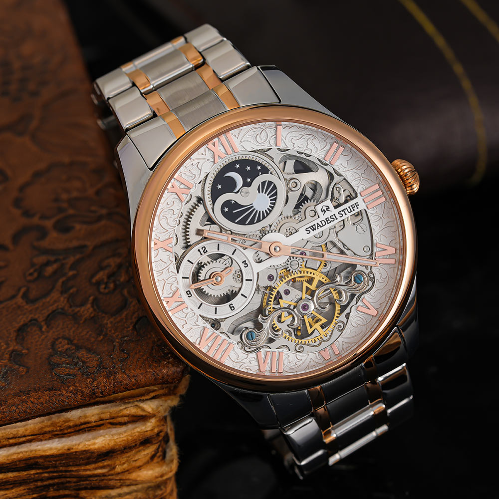 Aristocracy by Swadesi Stuff is a master creation & a vintage beyond valuation. Crafted by the finest Indian artisans, the luxurious, automatic timepiece is surely a collectors item. The watch fluants a skelleton dial to add more to the premiumness & is held by a pair of sturdy metal straps. The movement technology used powers itself based on the hand movements you make. The masterpiece offers 5 years of movement warranty & 2 years of watch warranty. The eye-catching design of the watch feels elegant on the wrist & is bold enough to liaise the Swadesi Sentiments.