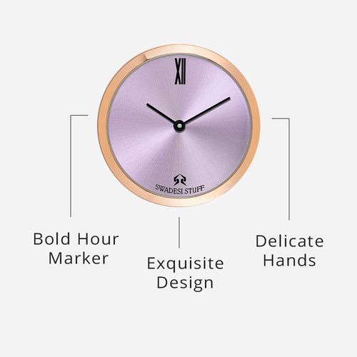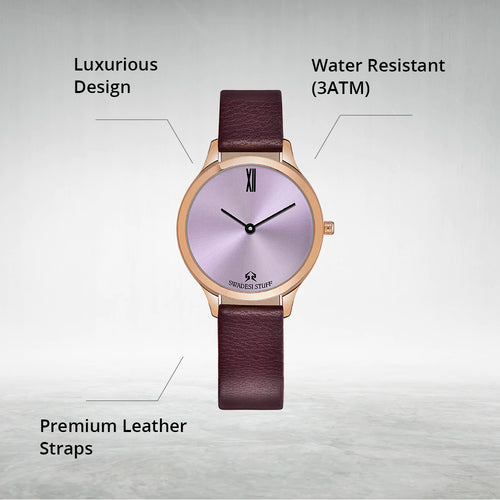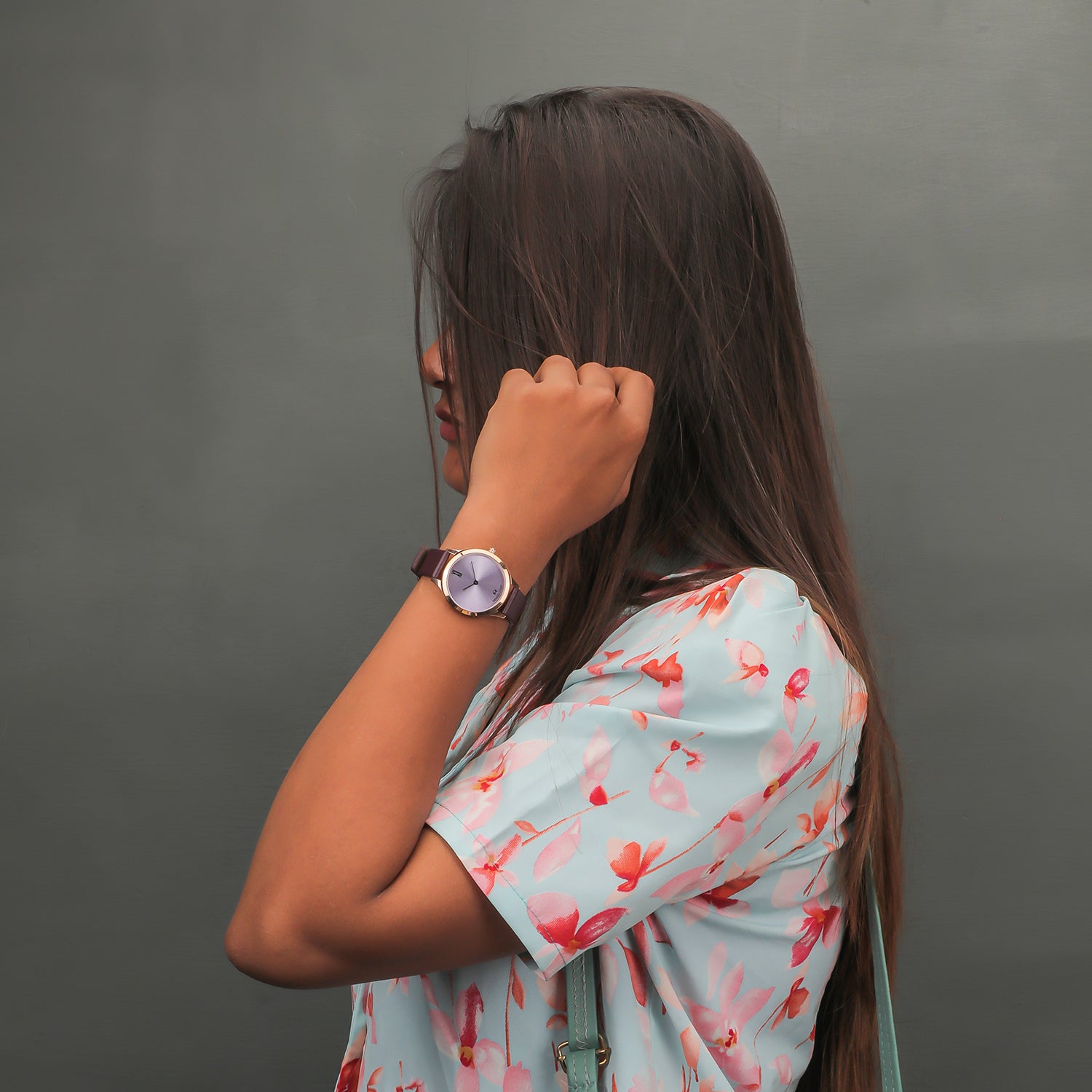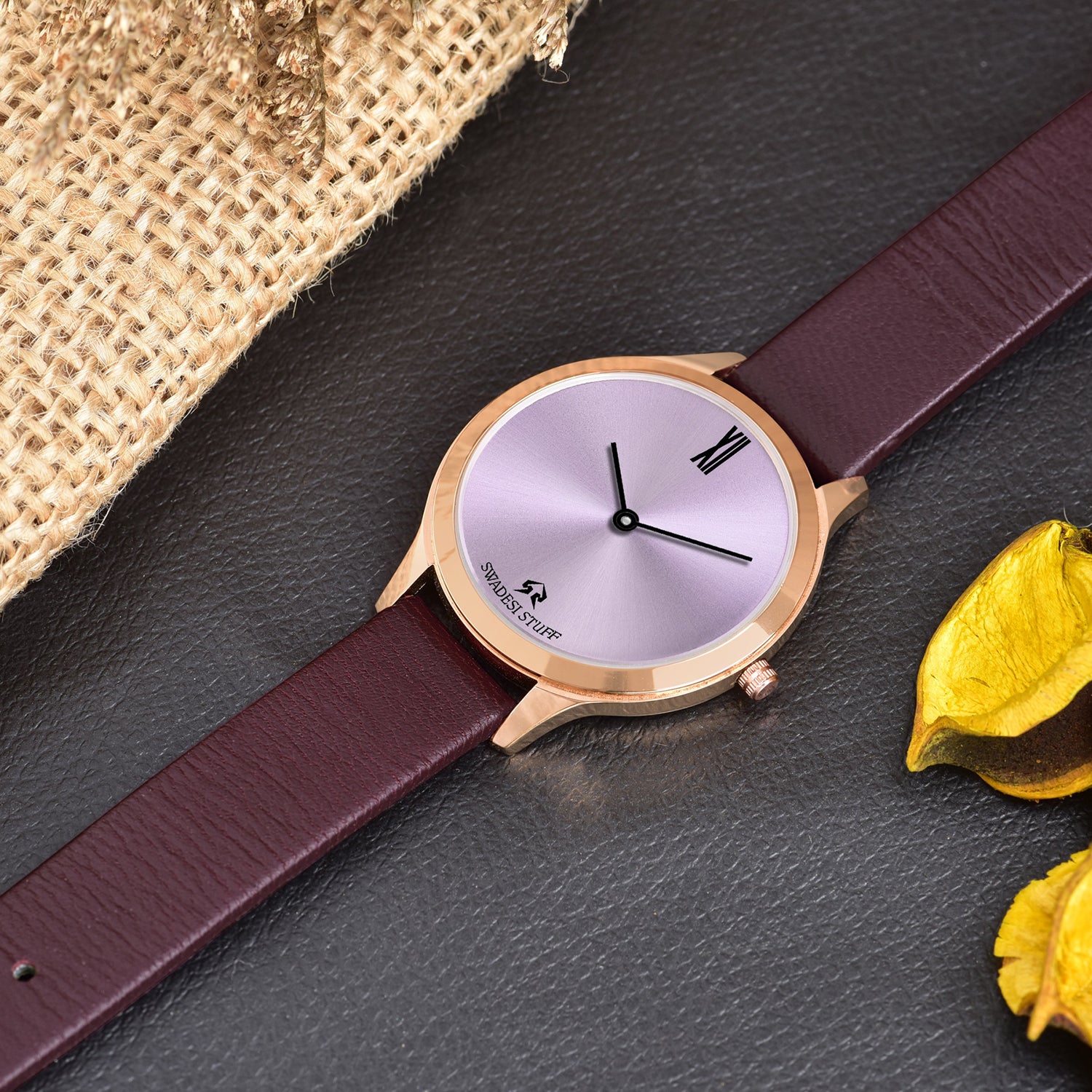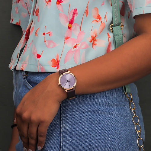 A luxurious watch with a round face & purple dial with bold hour markers and delicate hands.