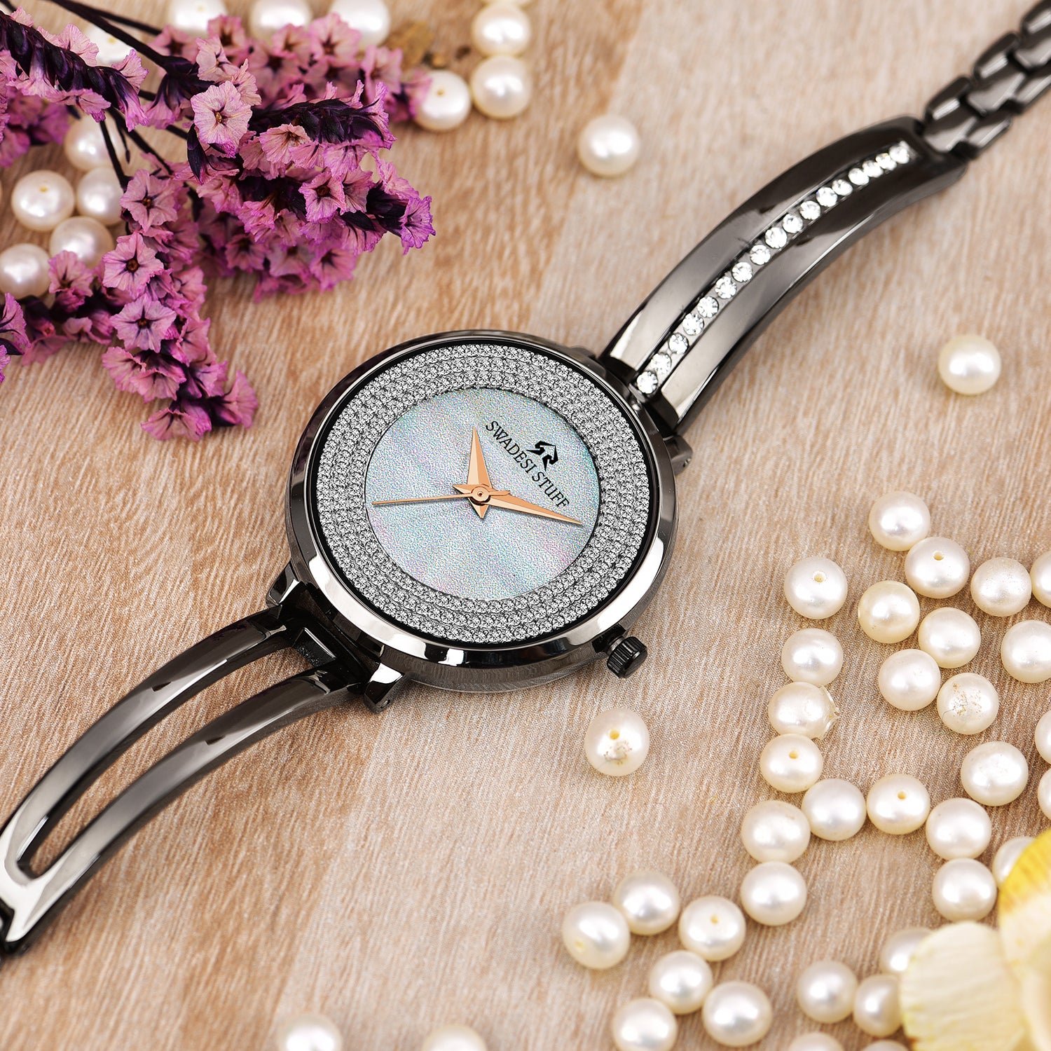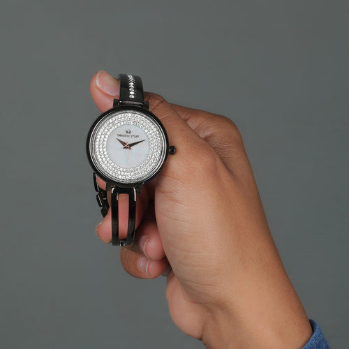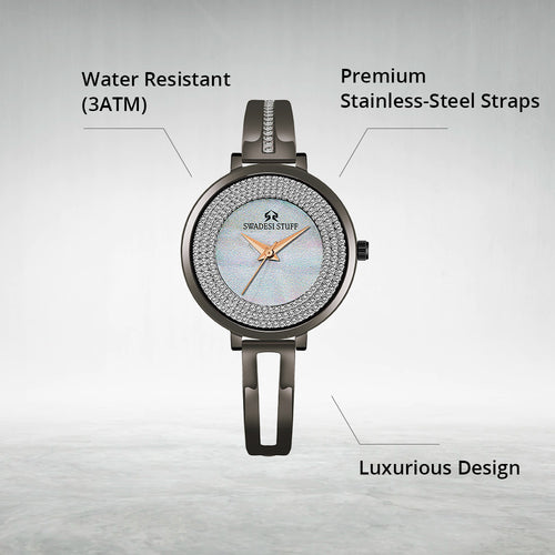 The timepiece is held by a pair of premium stainless-steel straps hand-studded with diamonds that are durable & super comfortable on the wrist