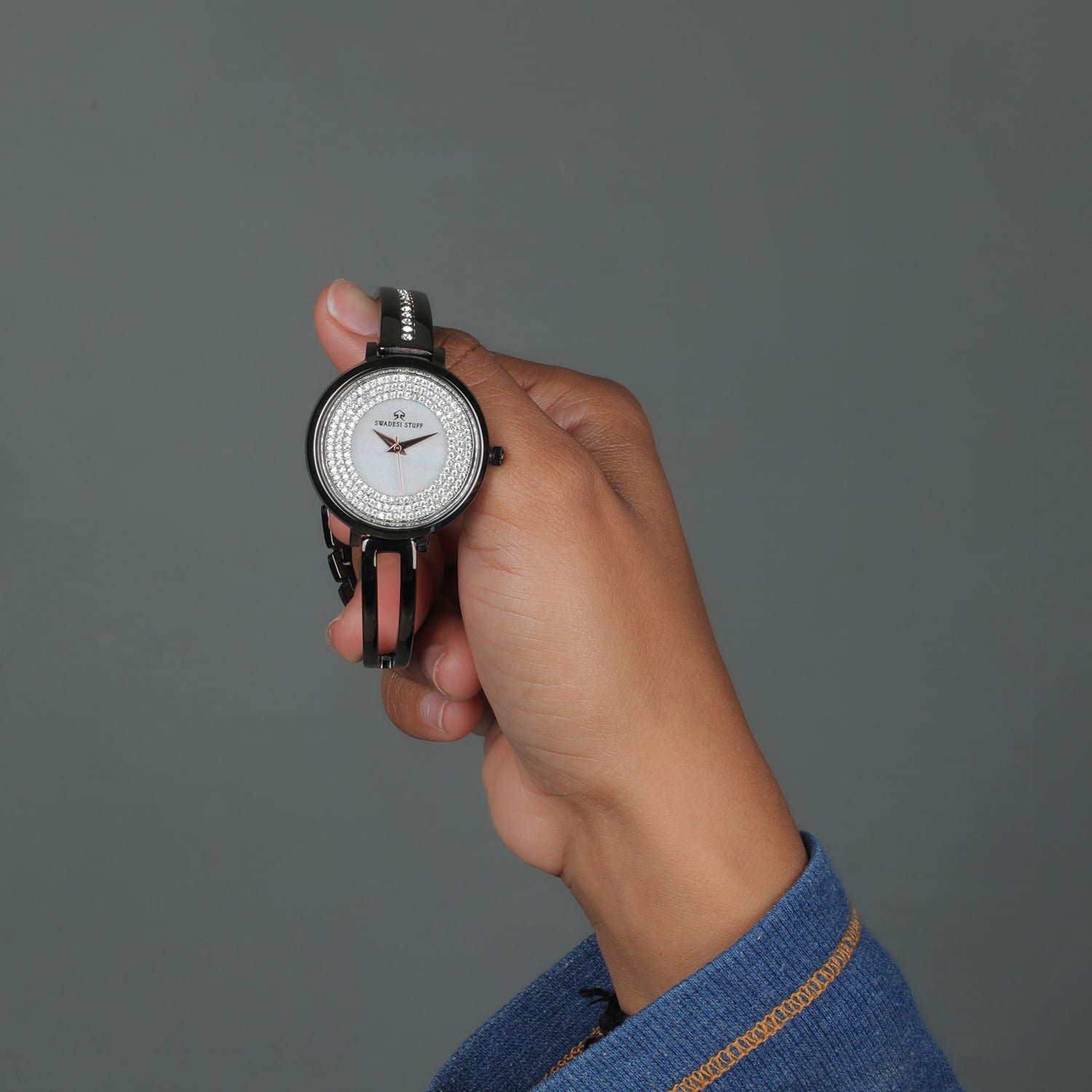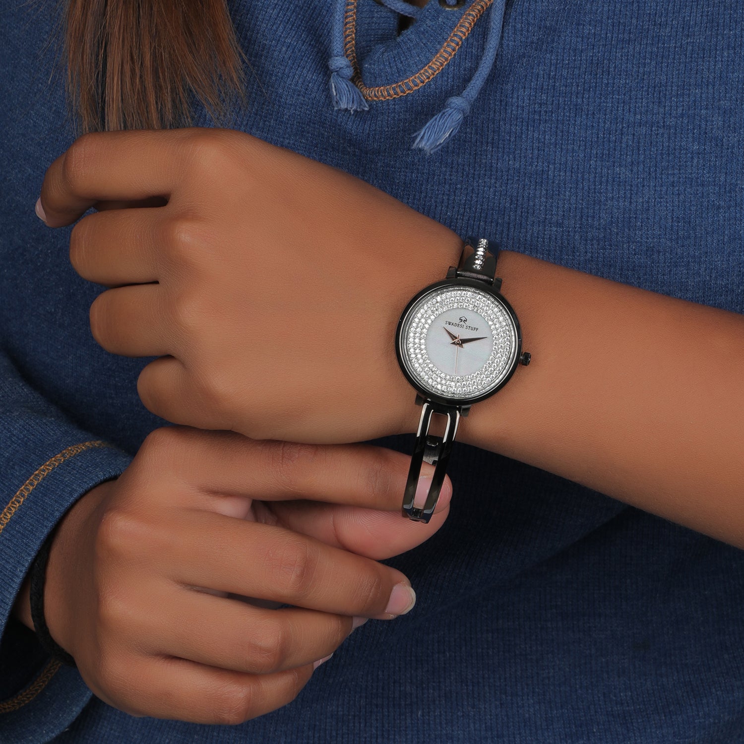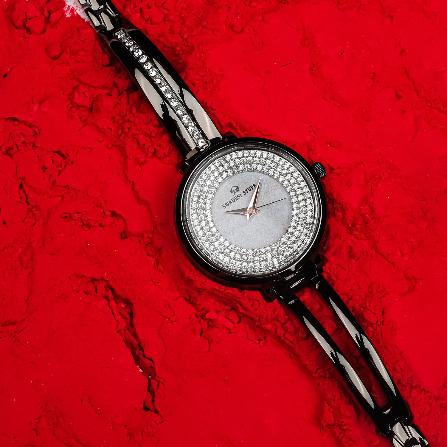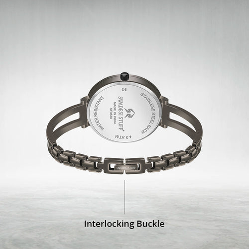Charm by Swadesi Stuff is an exemplary timepiece inspired by modern art. It is designed, crafted and conceptualised by some of the finest craftsmen in India. The luxurious watch is hand-studded with diamonds on the dial as well as the strap. The masterpiece is powered by a significant piece of Japanese movement machinery & is held by a pair of premium stainless steel straps. Charm has an elegant design which is bold enough to liaise the Swadesi Sentiments.