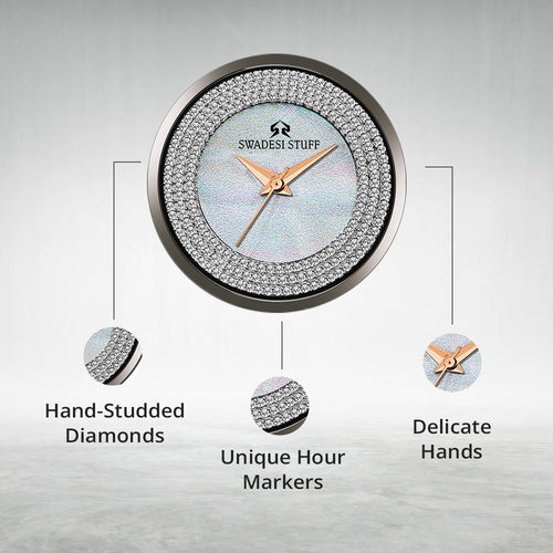 A luxurious diamond studded watch with a round face & fog grey dial with unique hour markers and delicate hands