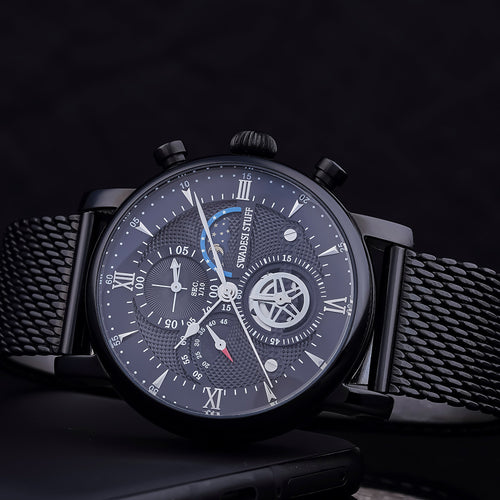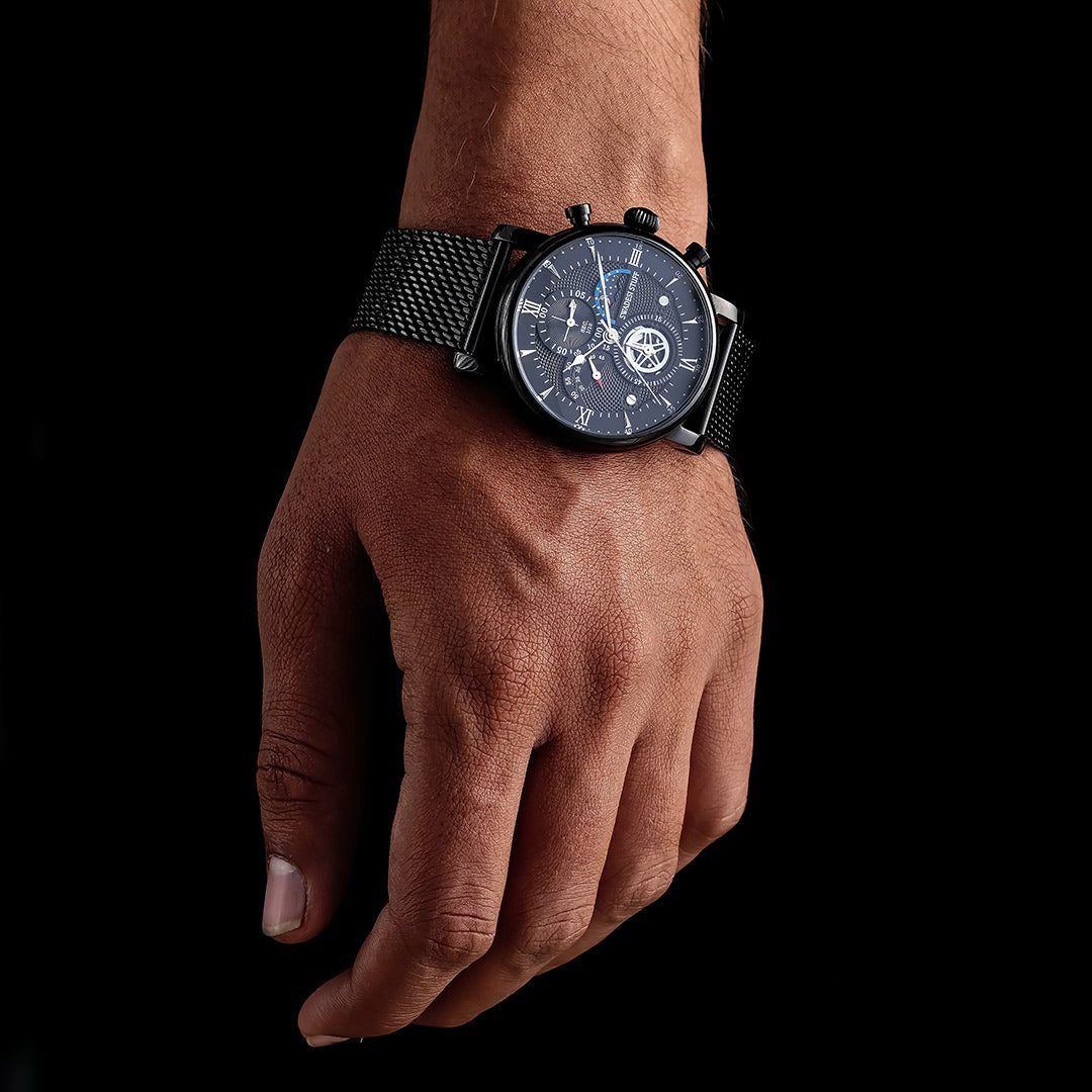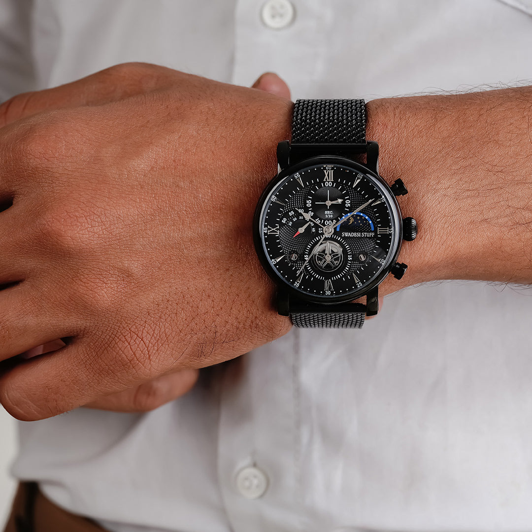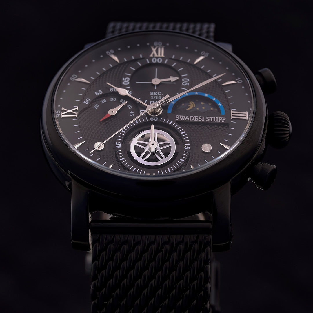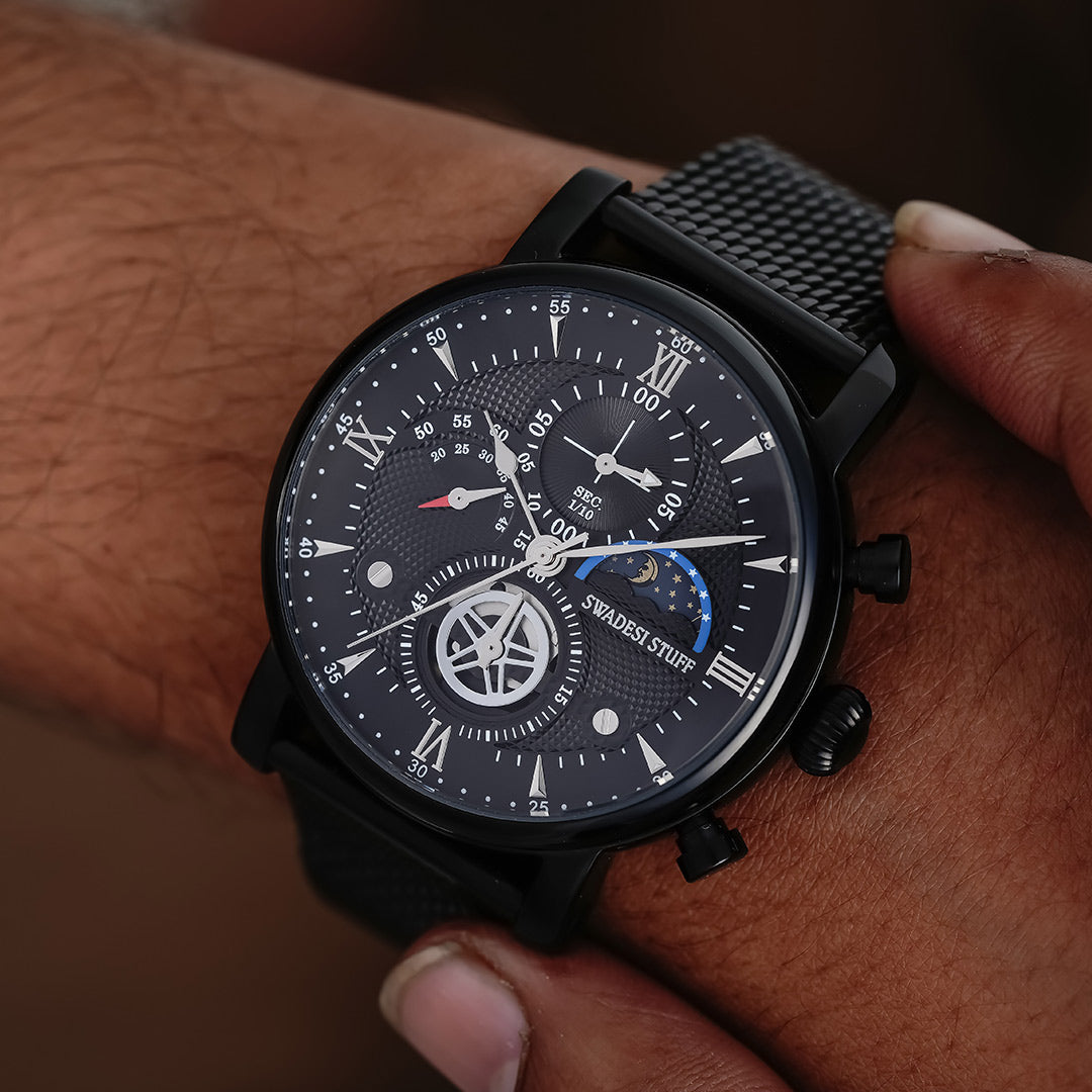 Cognoscenti by Swadesi Stuff is a master timepiece conceptualized, designed & crafted proudly in India. Designed for men who have keen interest in astronomy, the premium timepiece has a unique ‘Sun-Moon’ indicator that changes as the day passes by. The watch has a premium metal dial & is held by a pair of sturdy stainless-steel straps which makes it ideal for multiple occasions. The eye-catching design of the watch feels elegant on the wrist & is bold enough to liaise the Swadesi Sentiments.
