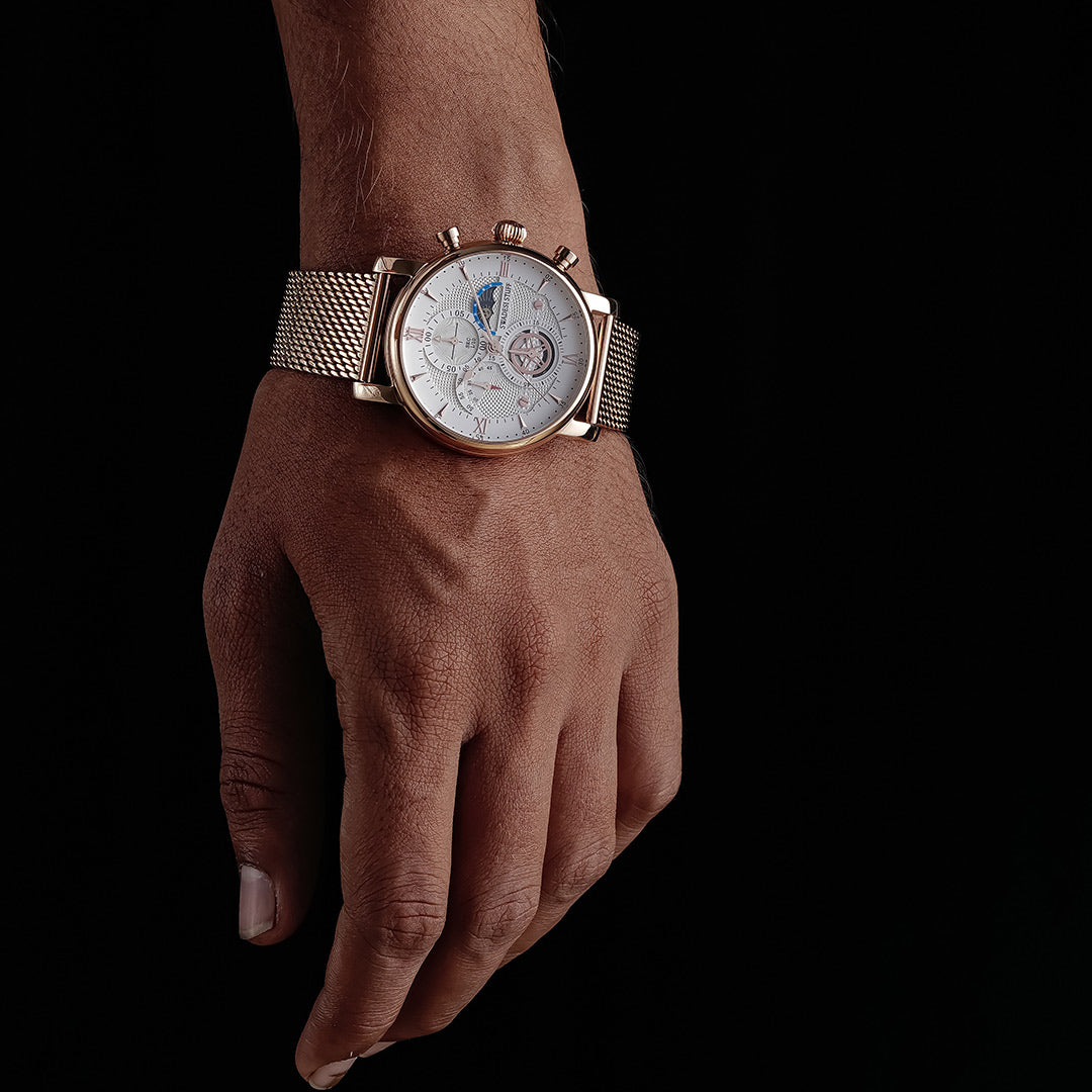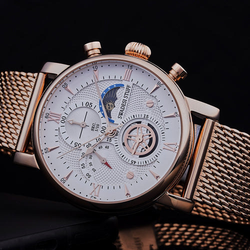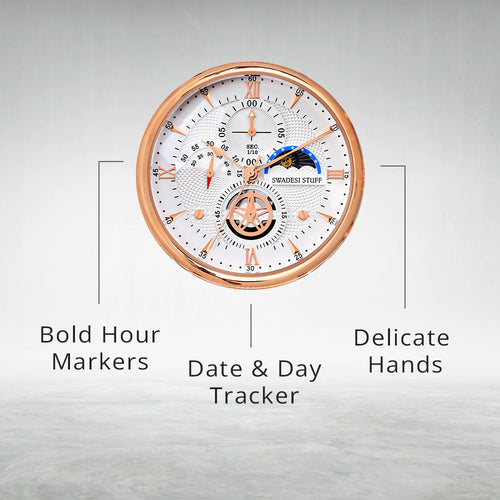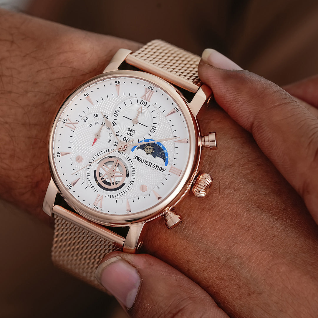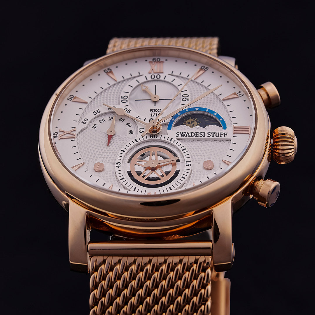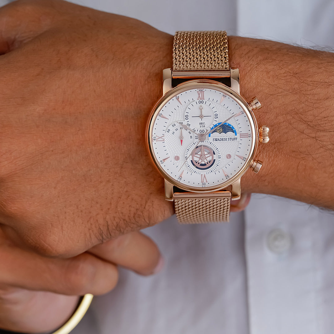 Cognoscenti by Swadesi Stuff is a master timepiece conceptualized, designed & crafted proudly in India. Designed for men who have keen interest in astronomy, the premium timepiece has a unique ‘Sun-Moon’ indicator that changes as the day passes by. The watch has a premium metal dial & is held by a pair of sturdy stainless-steel straps which makes it ideal for multiple occasions. The eye-catching design of the watch feels elegant on the wrist & is bold enough to liaise the Swadesi Sentiments.