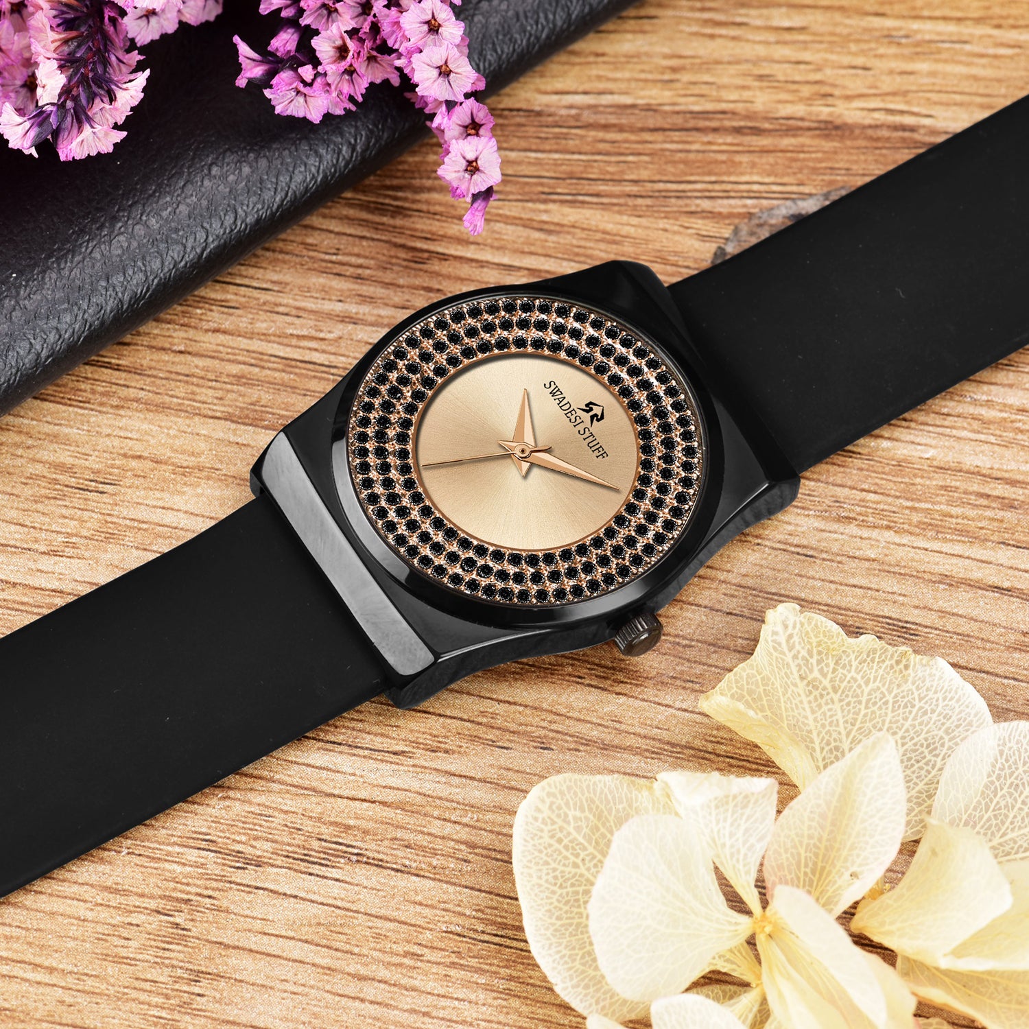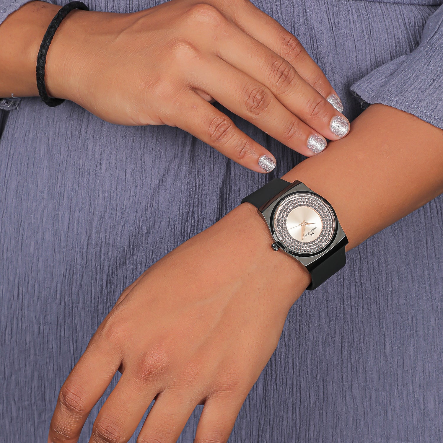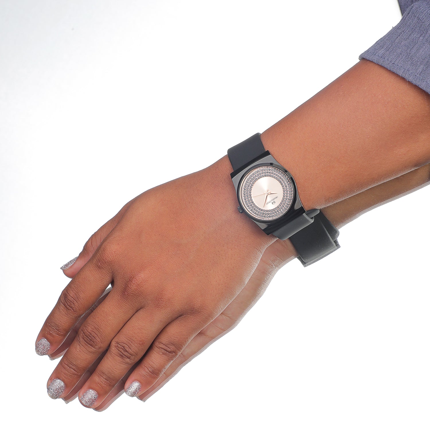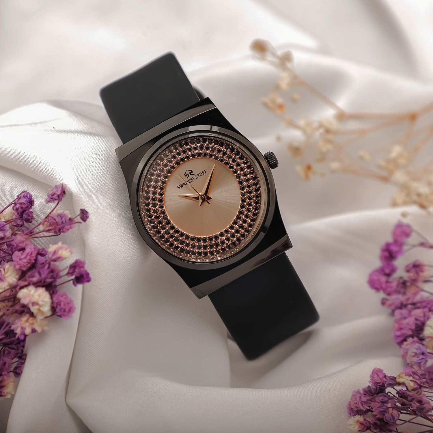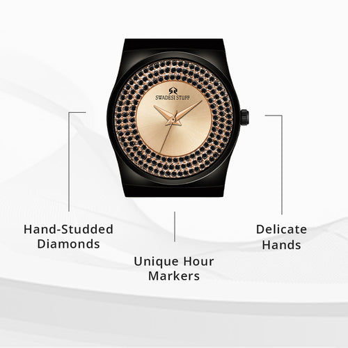 A luxurious diamond studded watch with a round face & rose gold dial with unique hour markers and delicate hands
