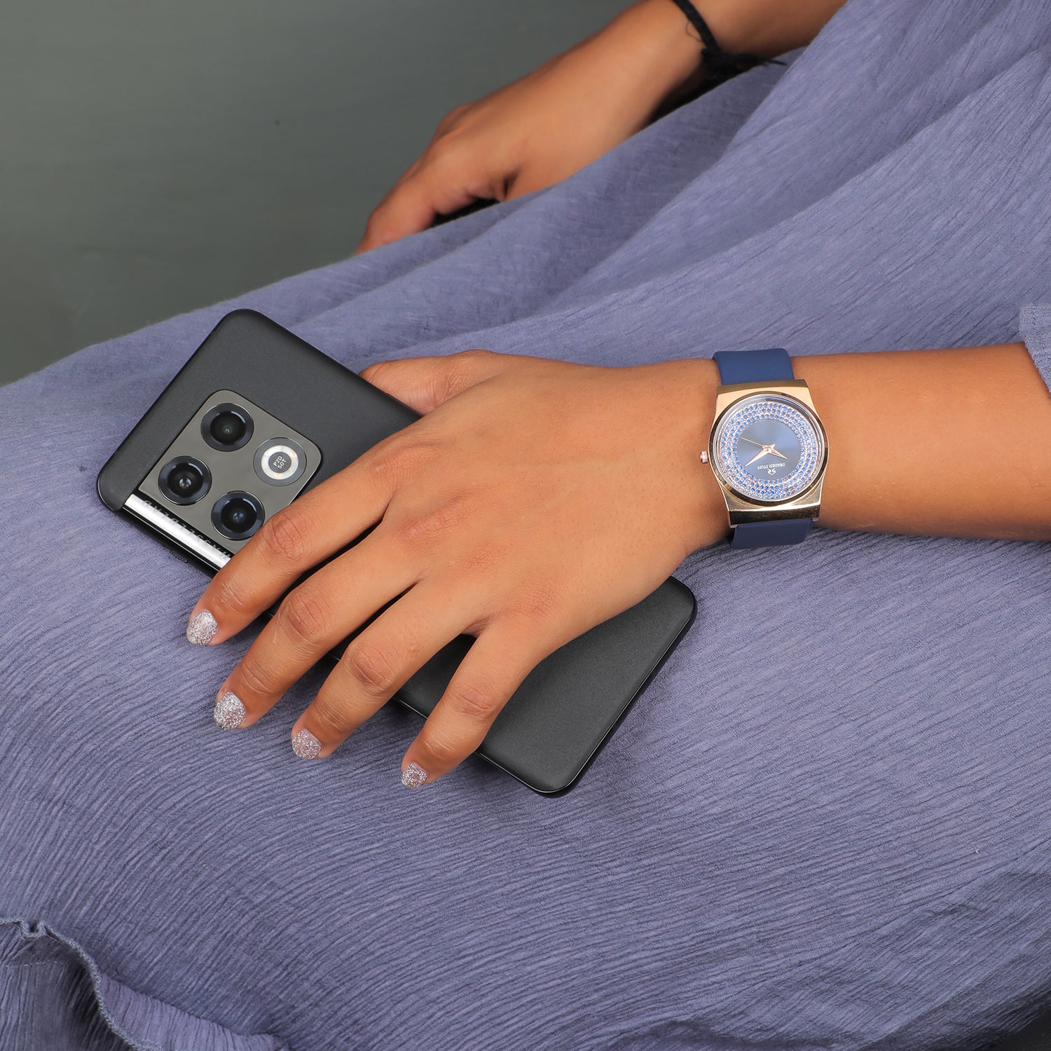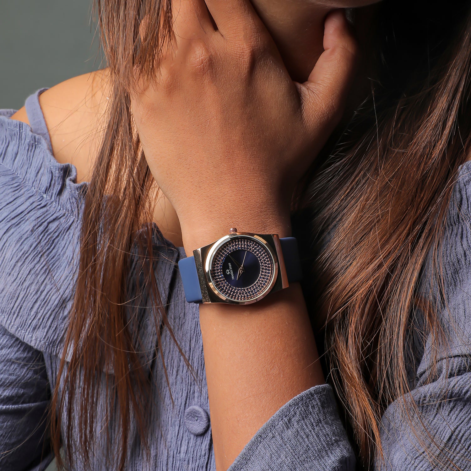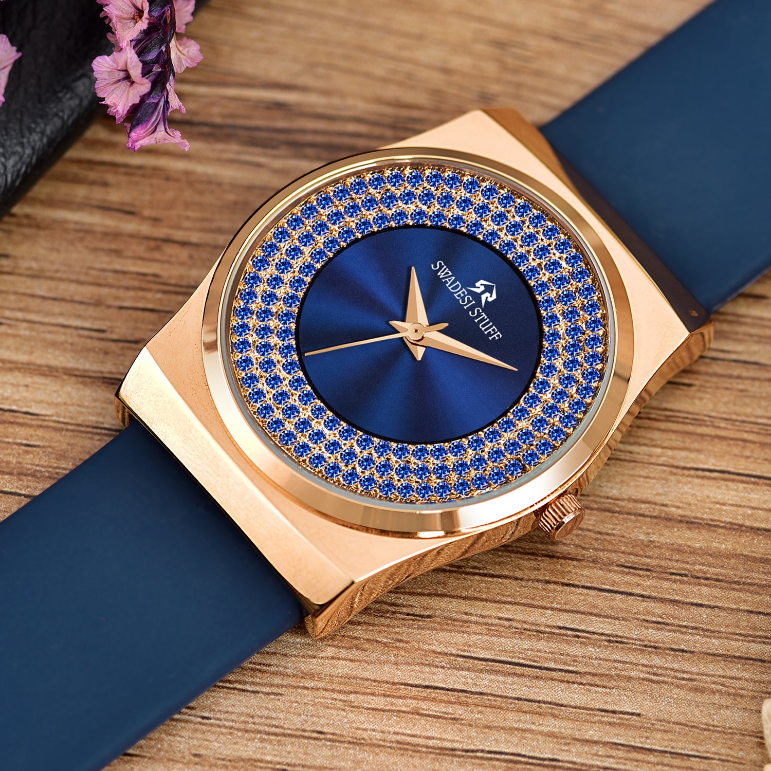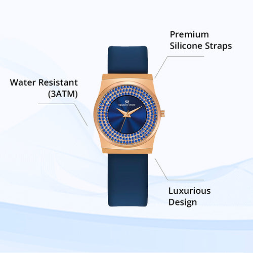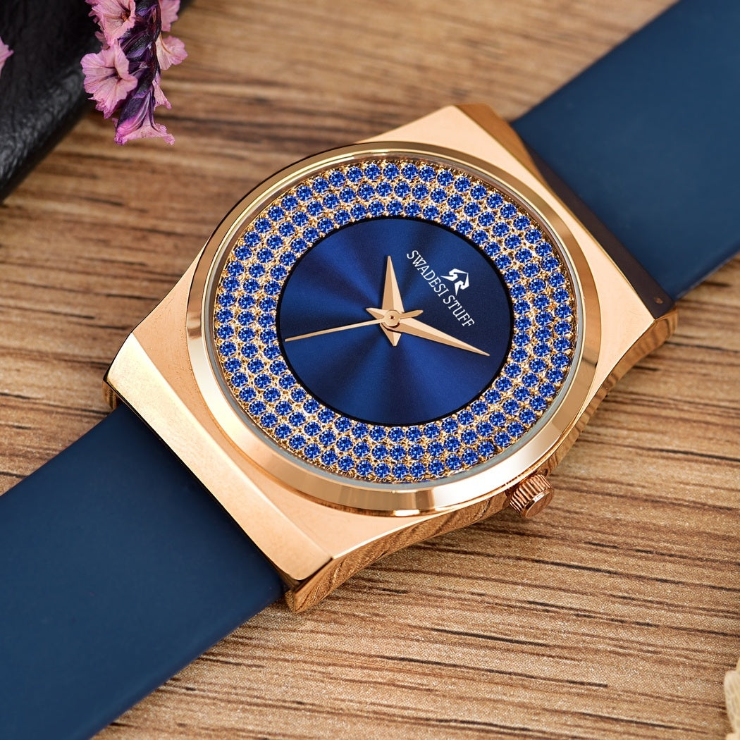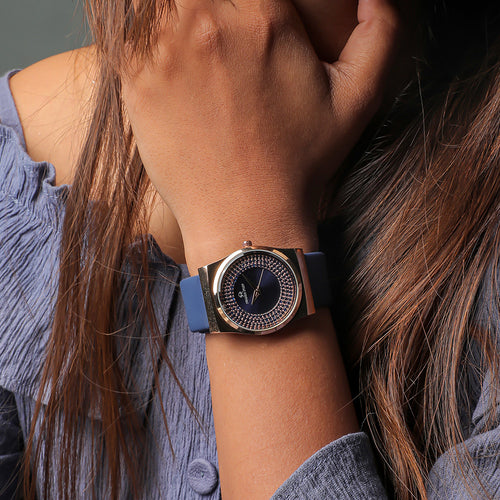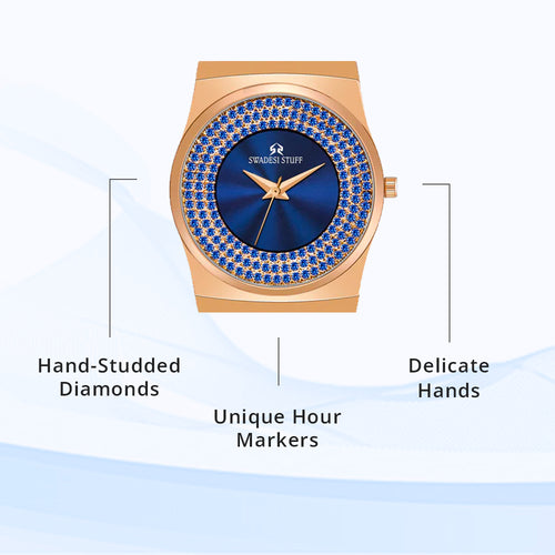 A luxurious diamond studded watch with a round face & blue dial with unique hour markers and delicate hands