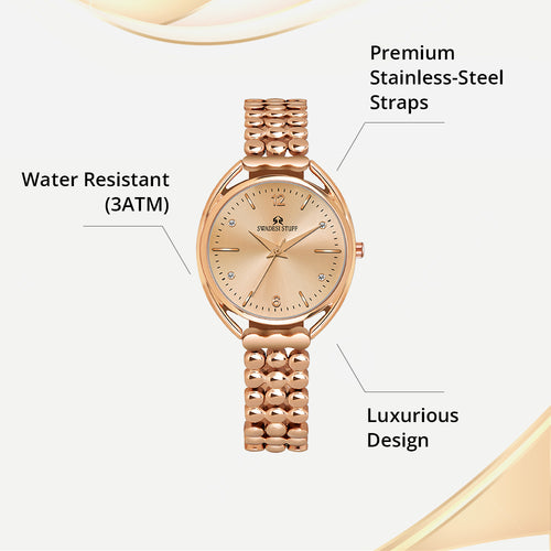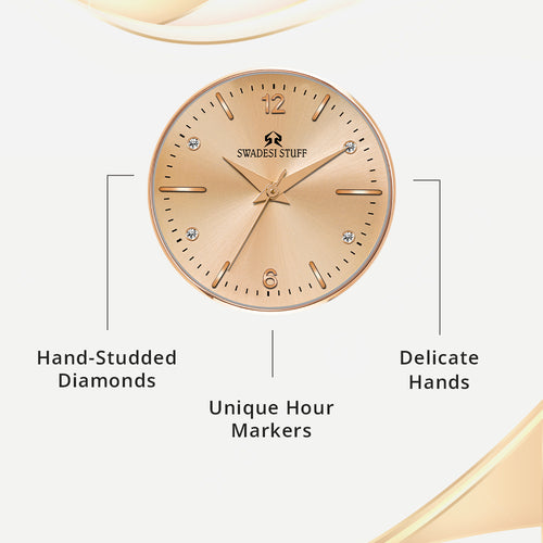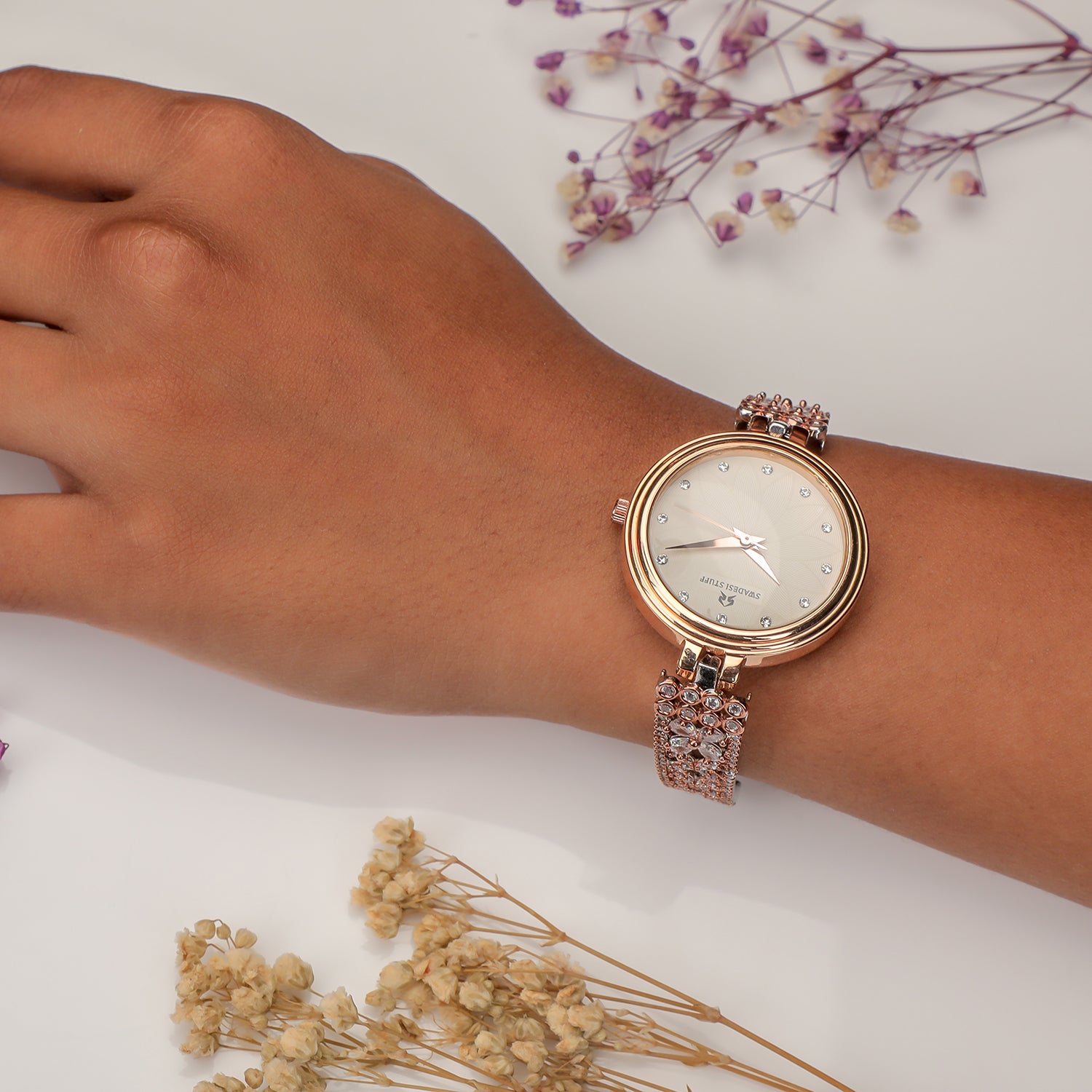 A luxurious diamond studded watch with a round face & rose gold dial with unique hour markers and delicate hands