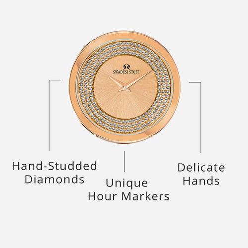 A luxurious diamond studded watch with a round face & rose gold dial with unique hour markers and delicate hands.