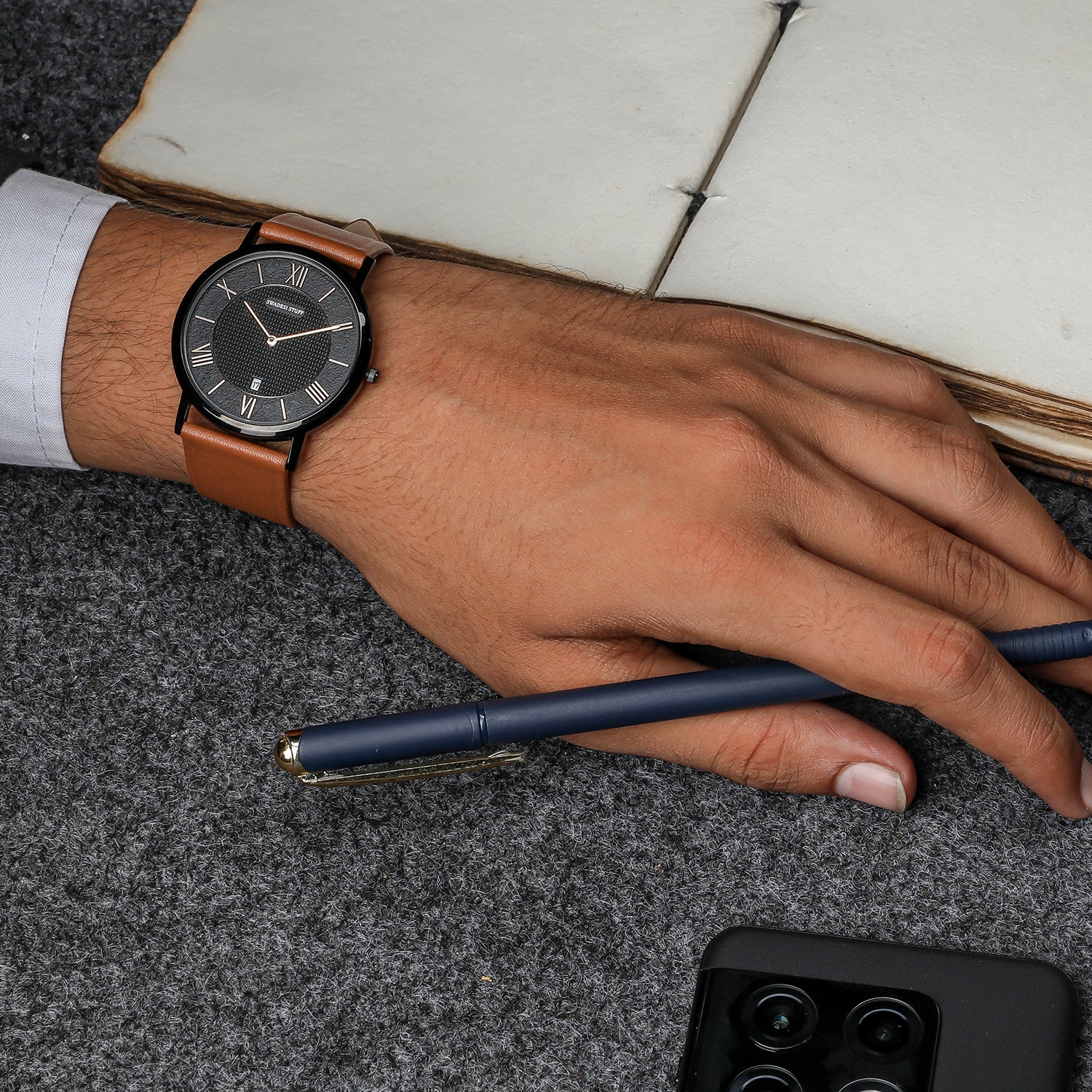 The Gallant Knight is a masterpiece proudly conceptualized, designed & crafted in India. Made with utmost care & perfection, it is supported by a powerful piece of Japanese machinery. The Gallant Knight is held firmly by a pair of lavish leather straps & resembles the charm & aura of a knight. Elegant on the wrist but bold enough to liaise the Swadesi sentiments.