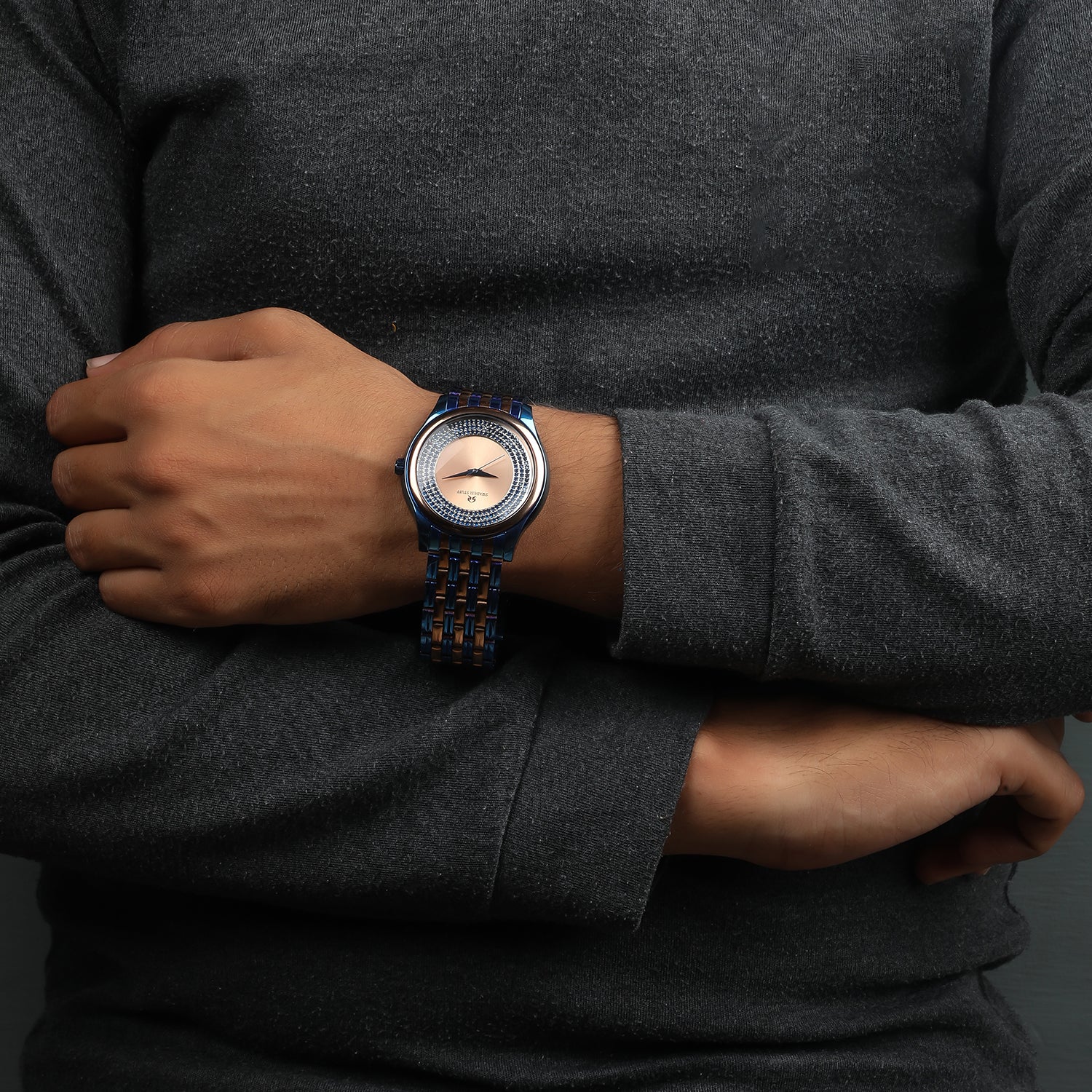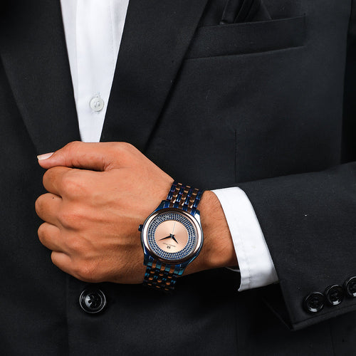 A luxurious diamond studded watch with a round face & rose gold dial with unique hour markers and delicate hands.