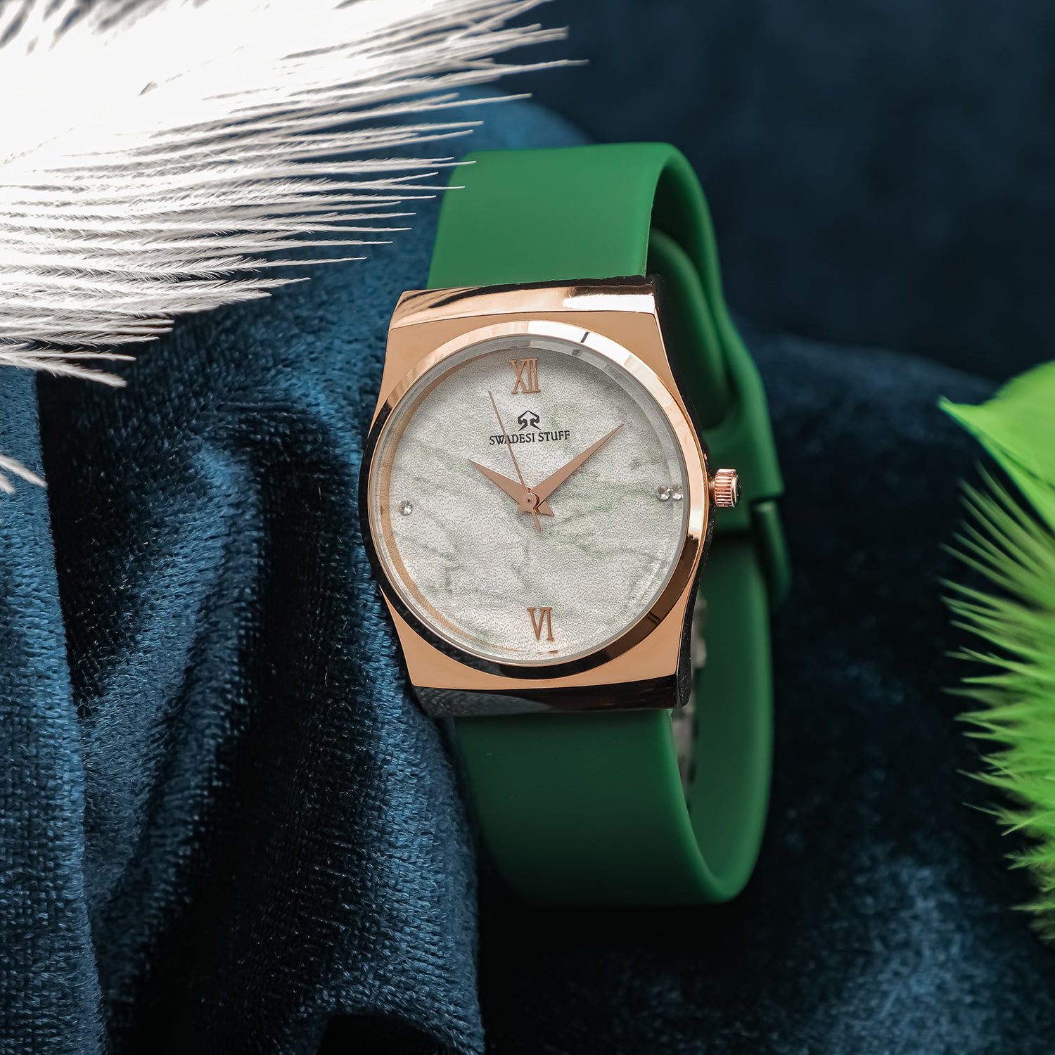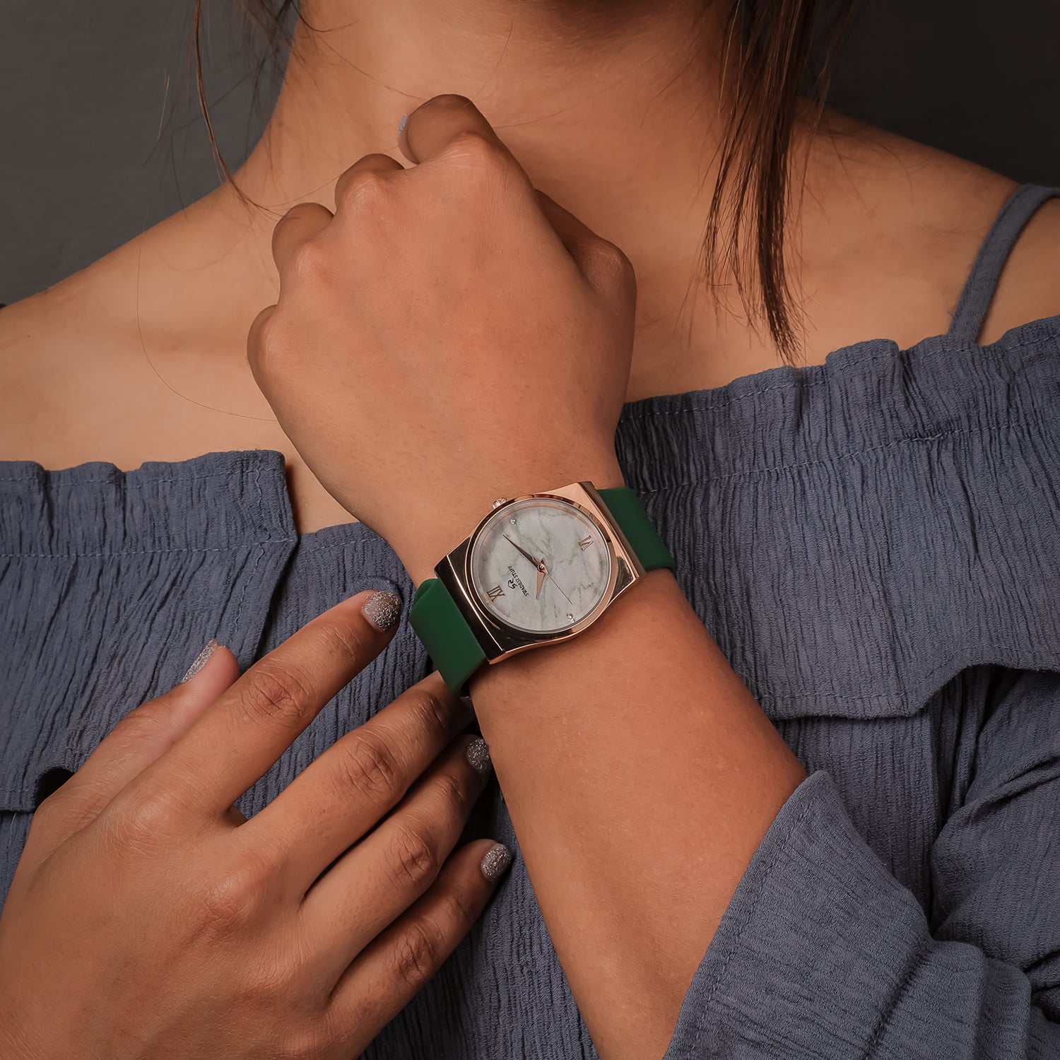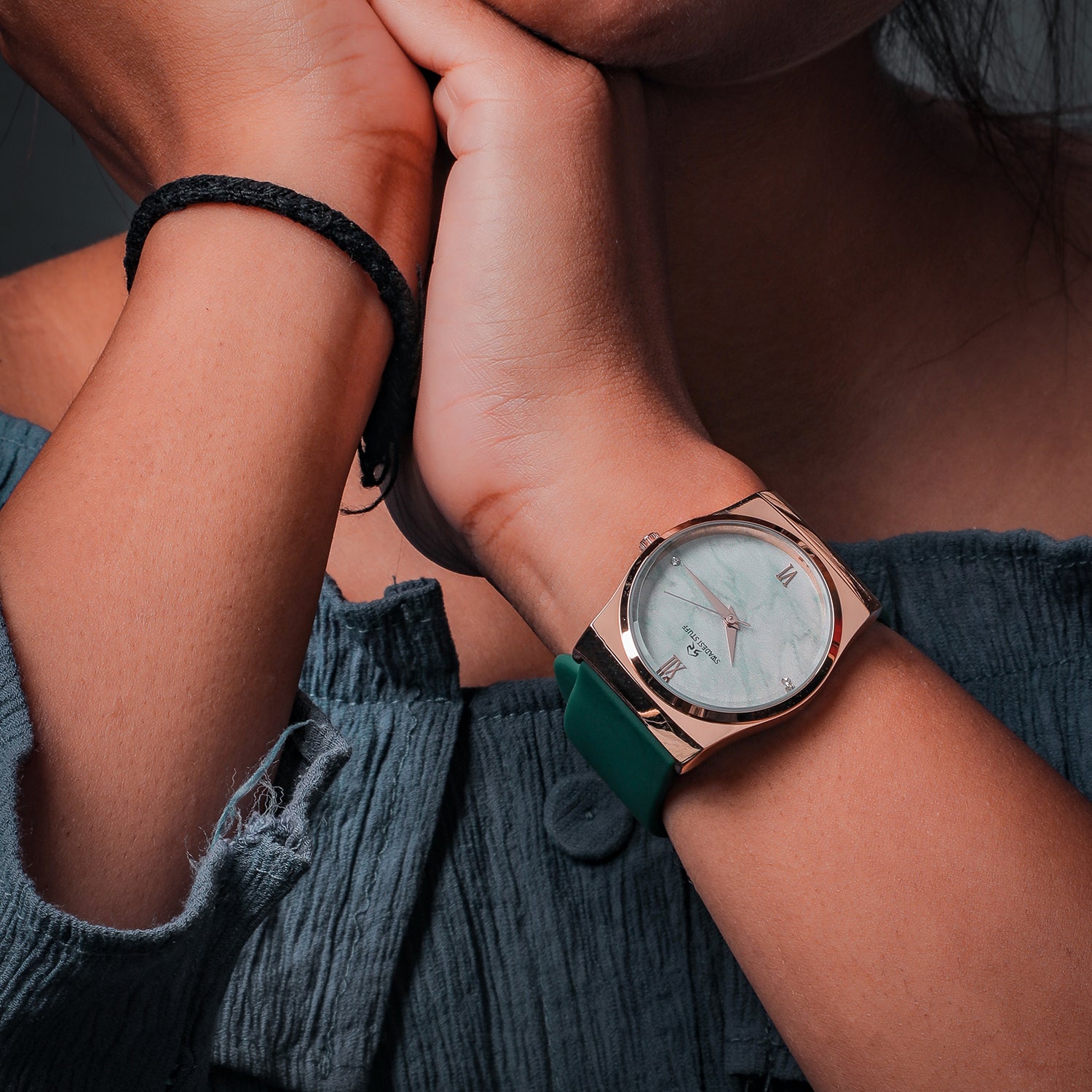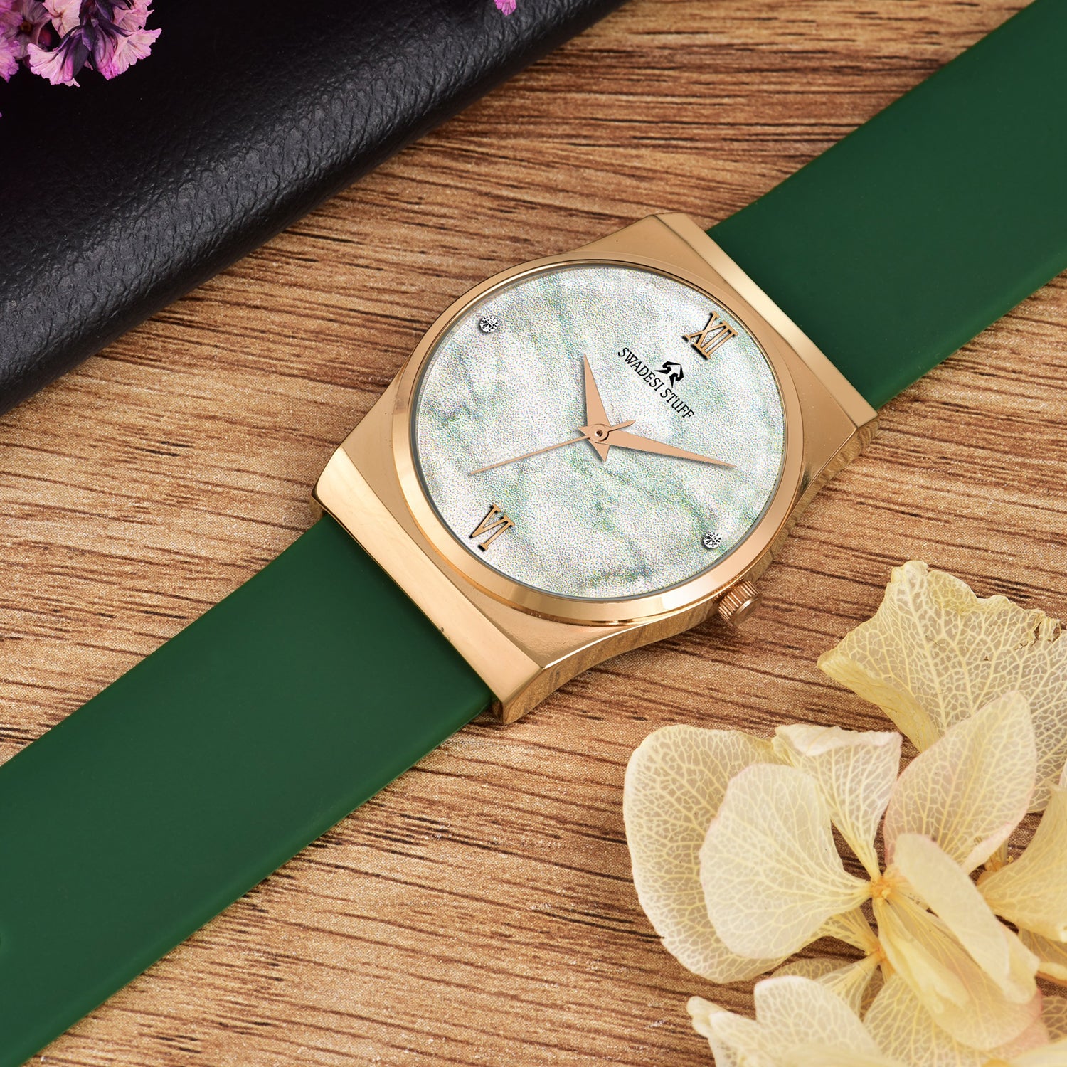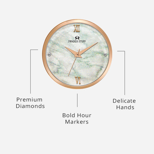 A luxurious watch with a round face & green dial with golden hour markers and delicate hands.