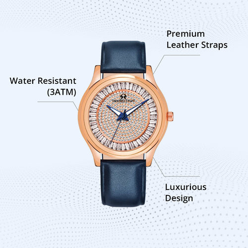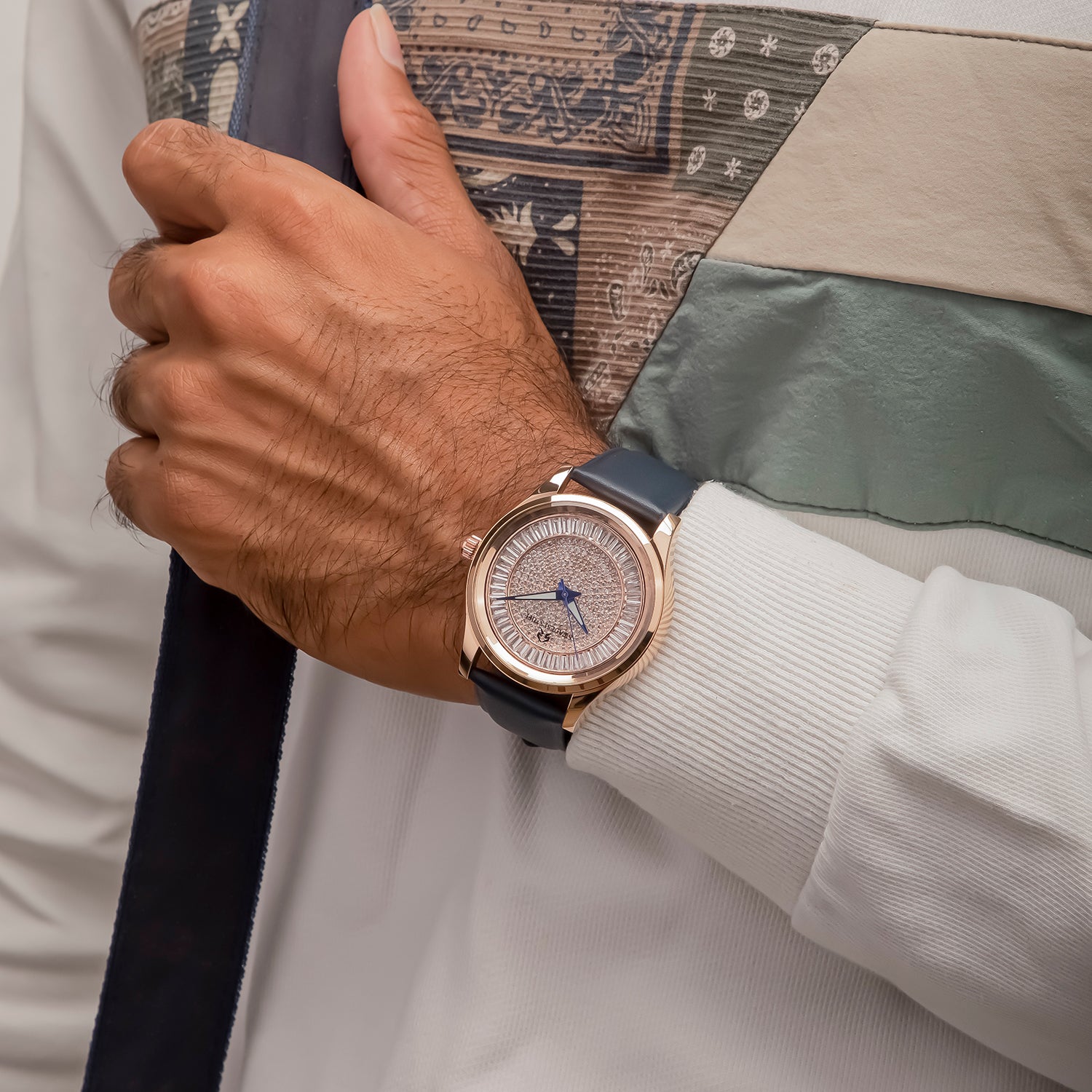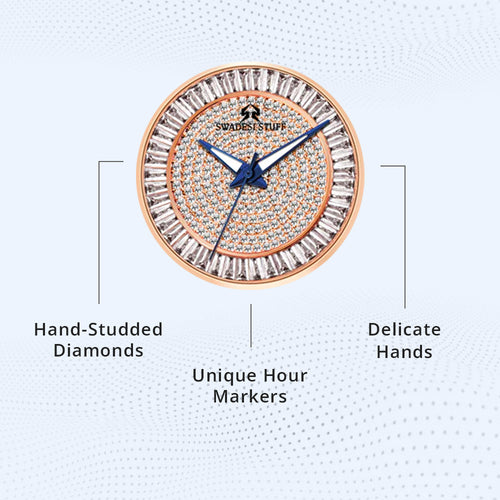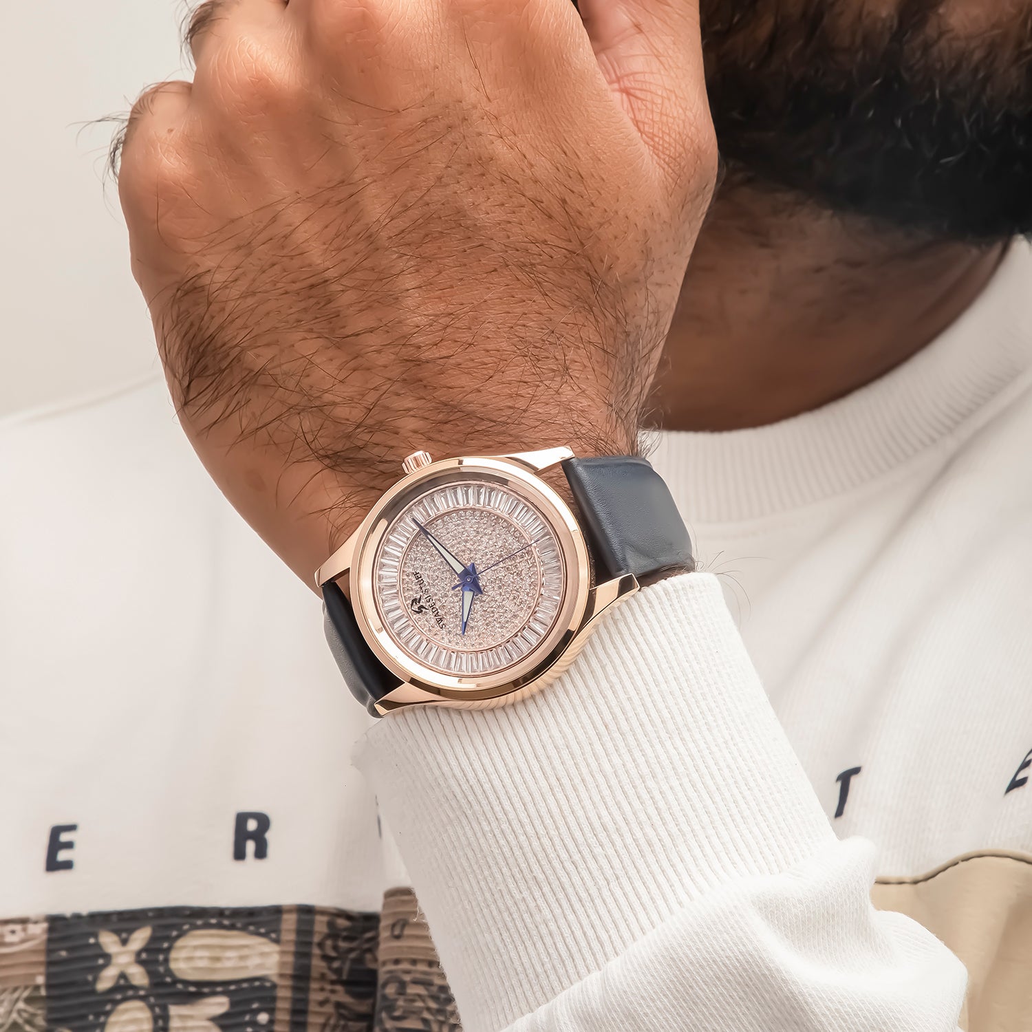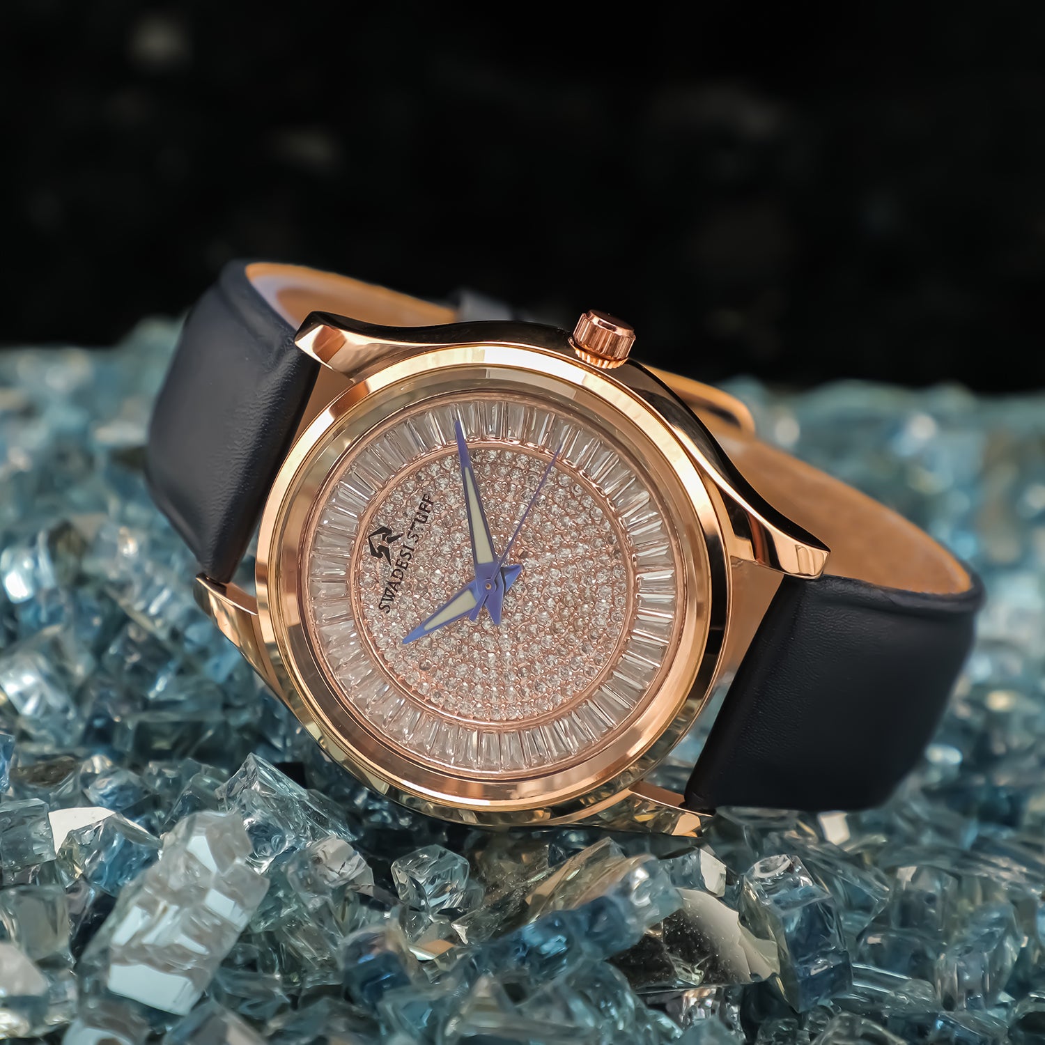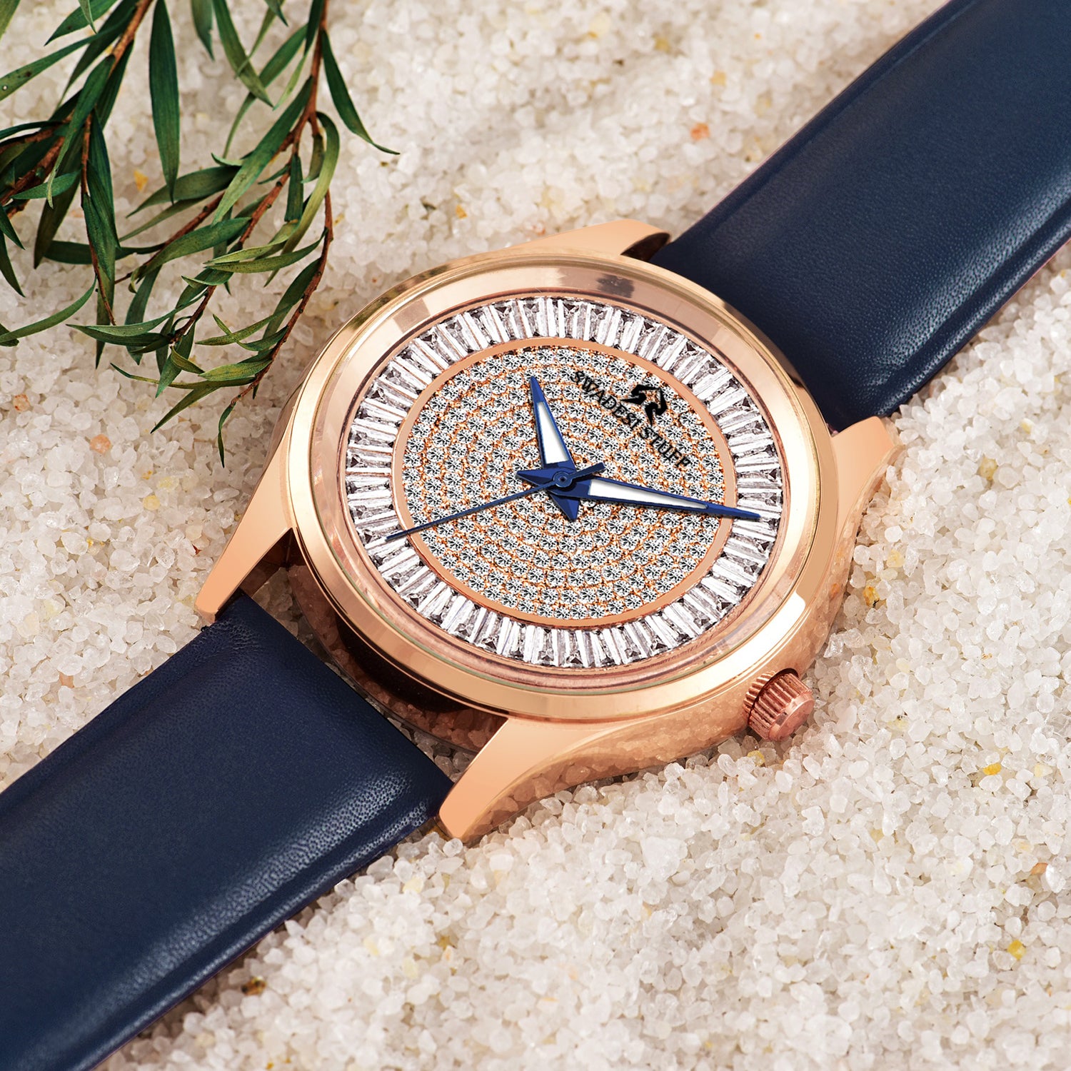 A luxurious diamond studded watch with a round face & rose gold dial with unique hour markers and delicate hands.