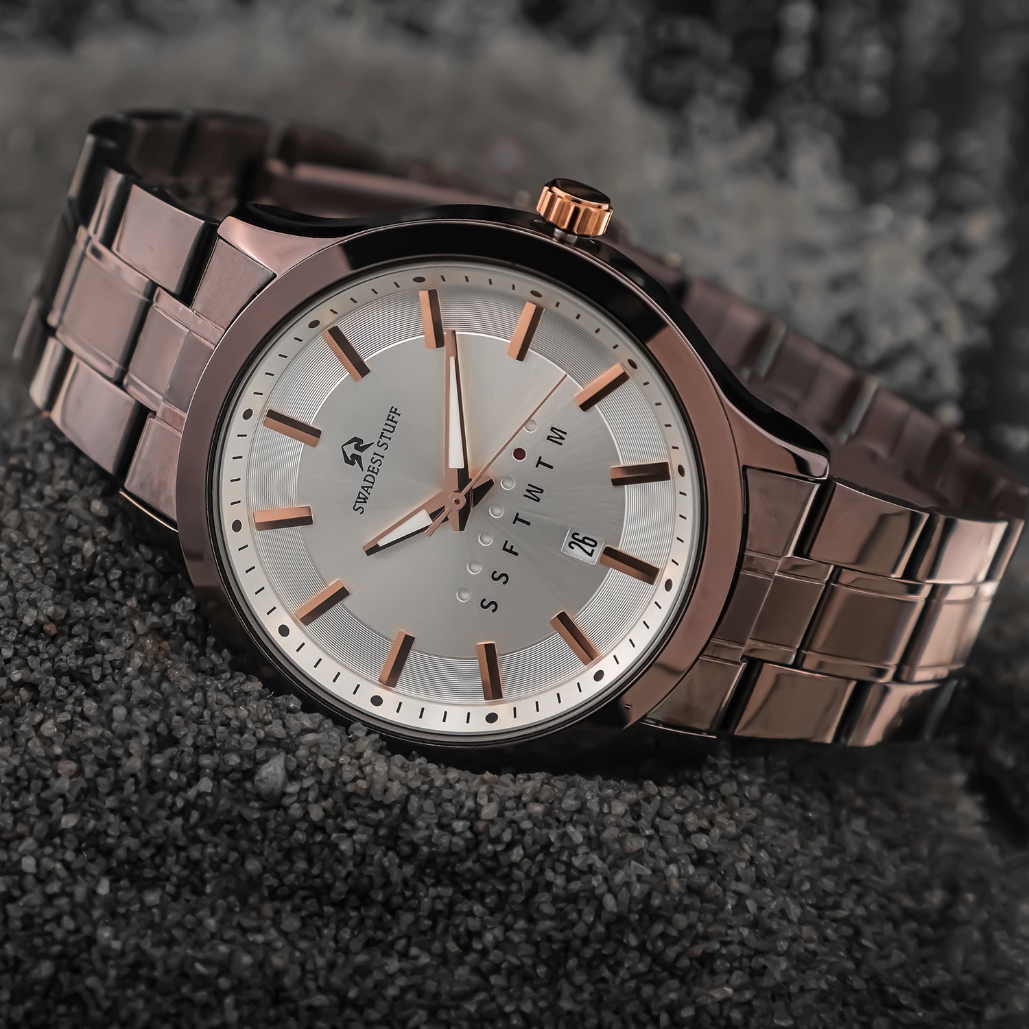 Handcrafted with utmost perfection & elegance, Resolute signifies luxury & class. Designed to replicate the majestic aura of the stud, it is built around a significant piece of indigenous movement technology & held by a pair of premium stainless-steel straps. The Resolute is a flawless timepiece which is elegant on the wrist but bold enough to liaise the Swadesi sentiments.