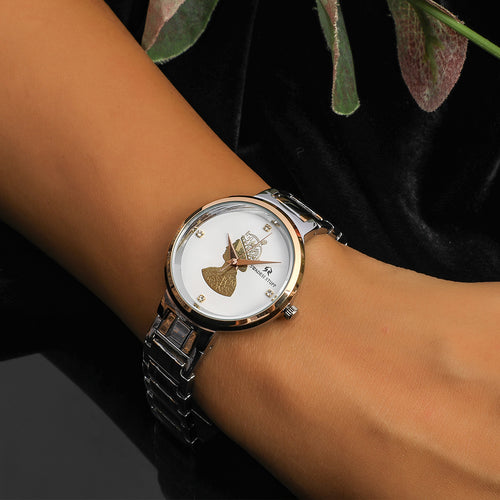 A luxurious watch with a round face & white dial with bold hour markers and delicate hands.