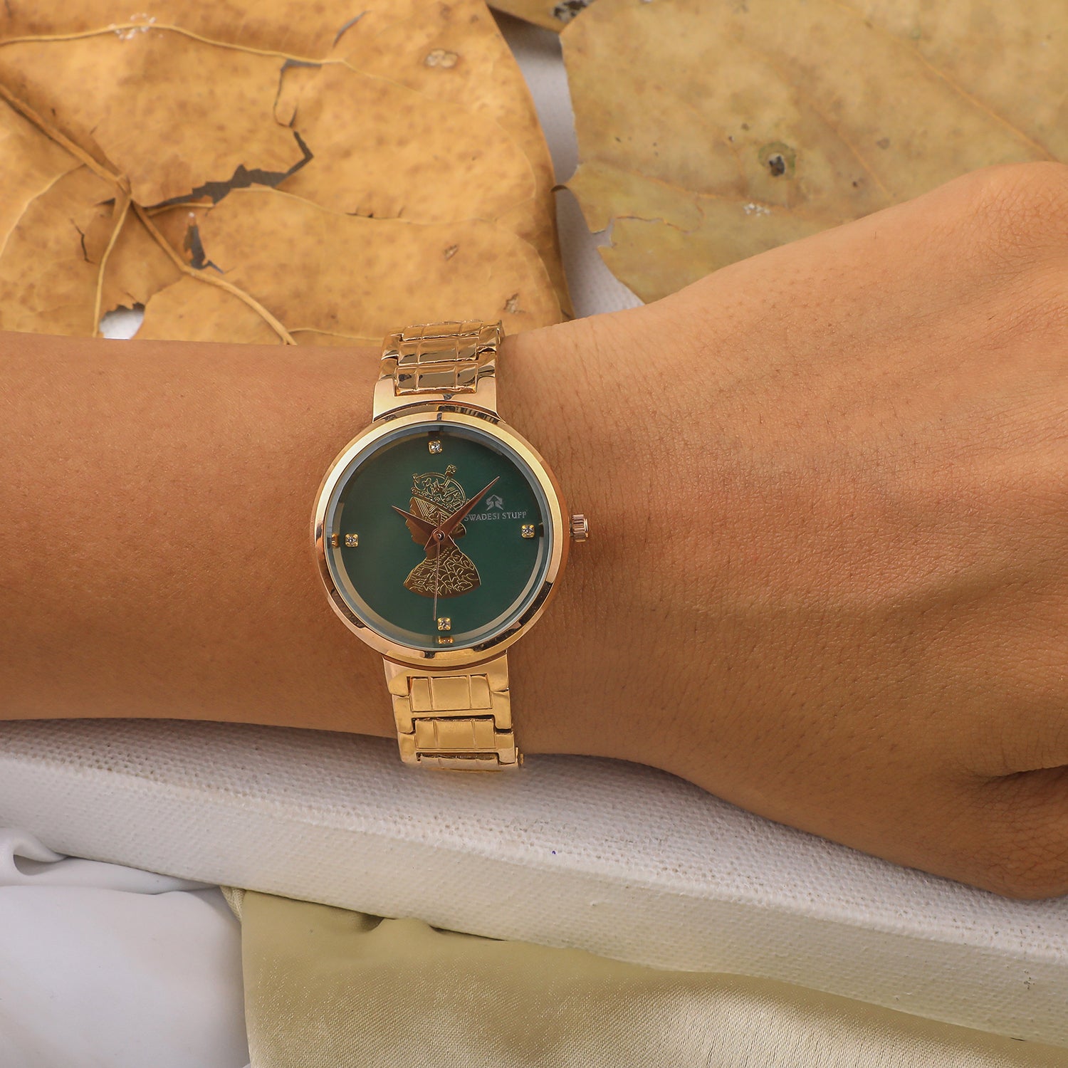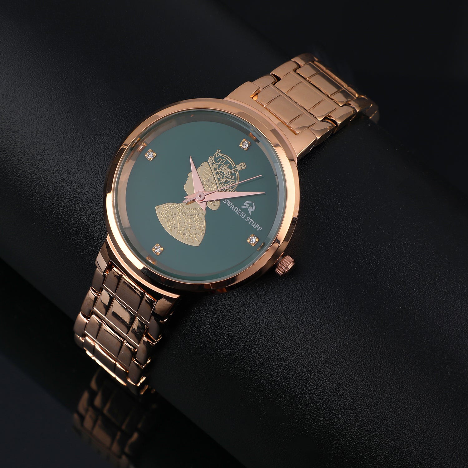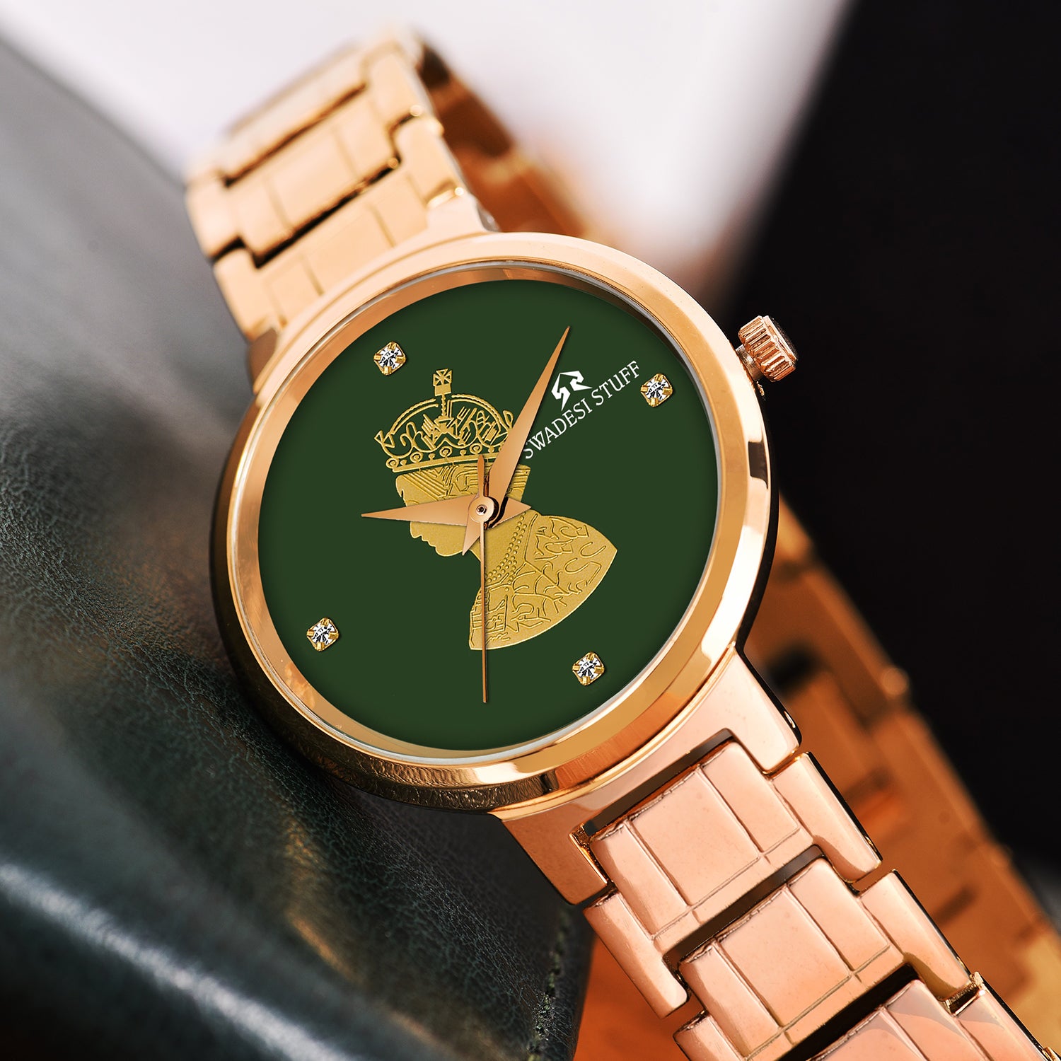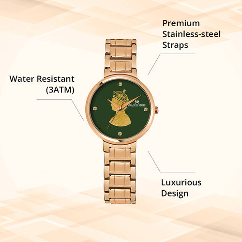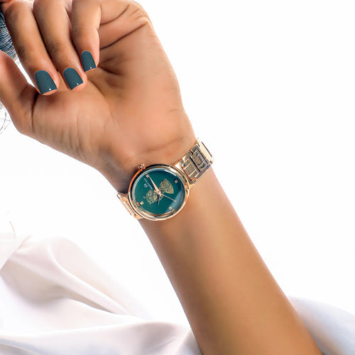 A luxurious watch with a round face & green dial with bold hour markers and delicate hands