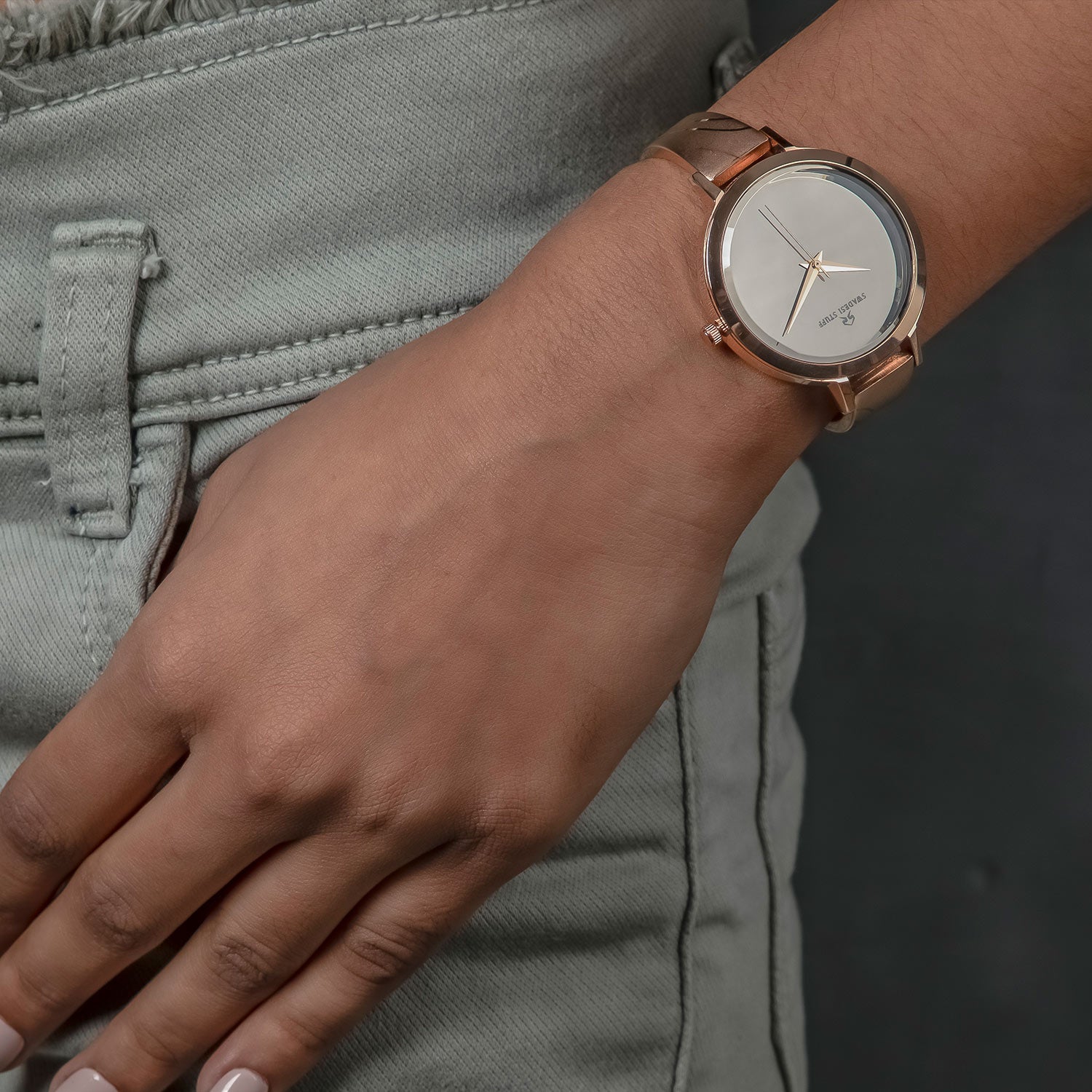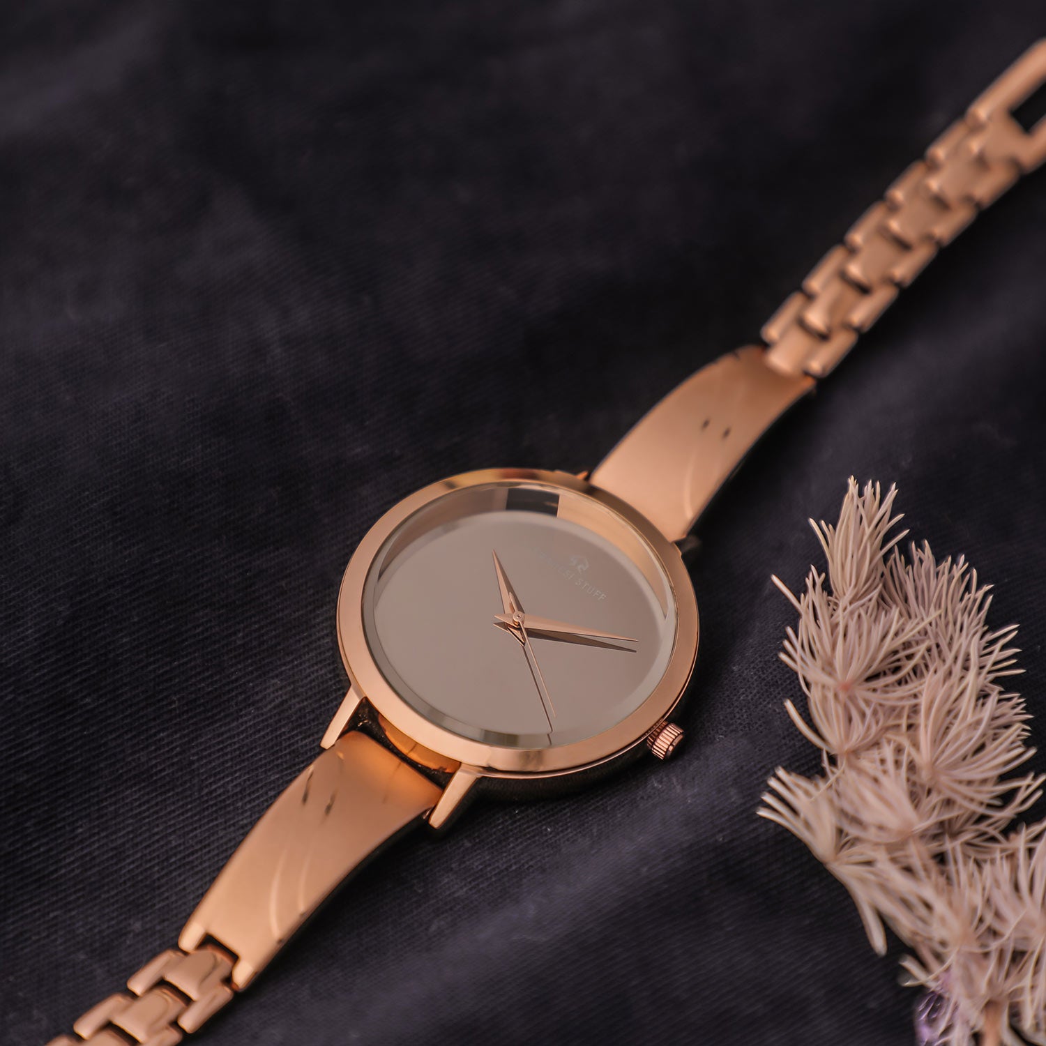 A luxurious diamond studded watch with a round face & mirror dial with unique hour markers and delicate hands.