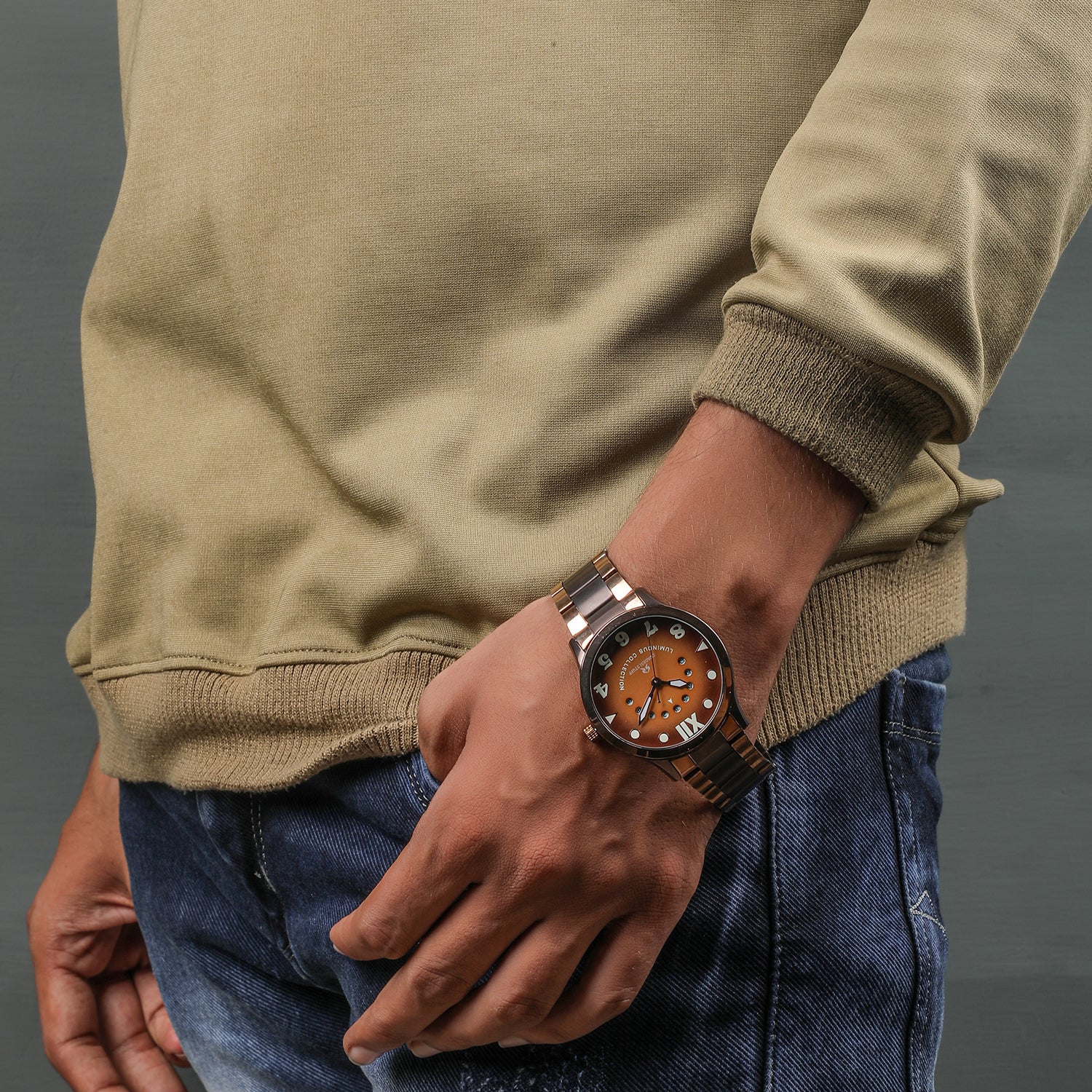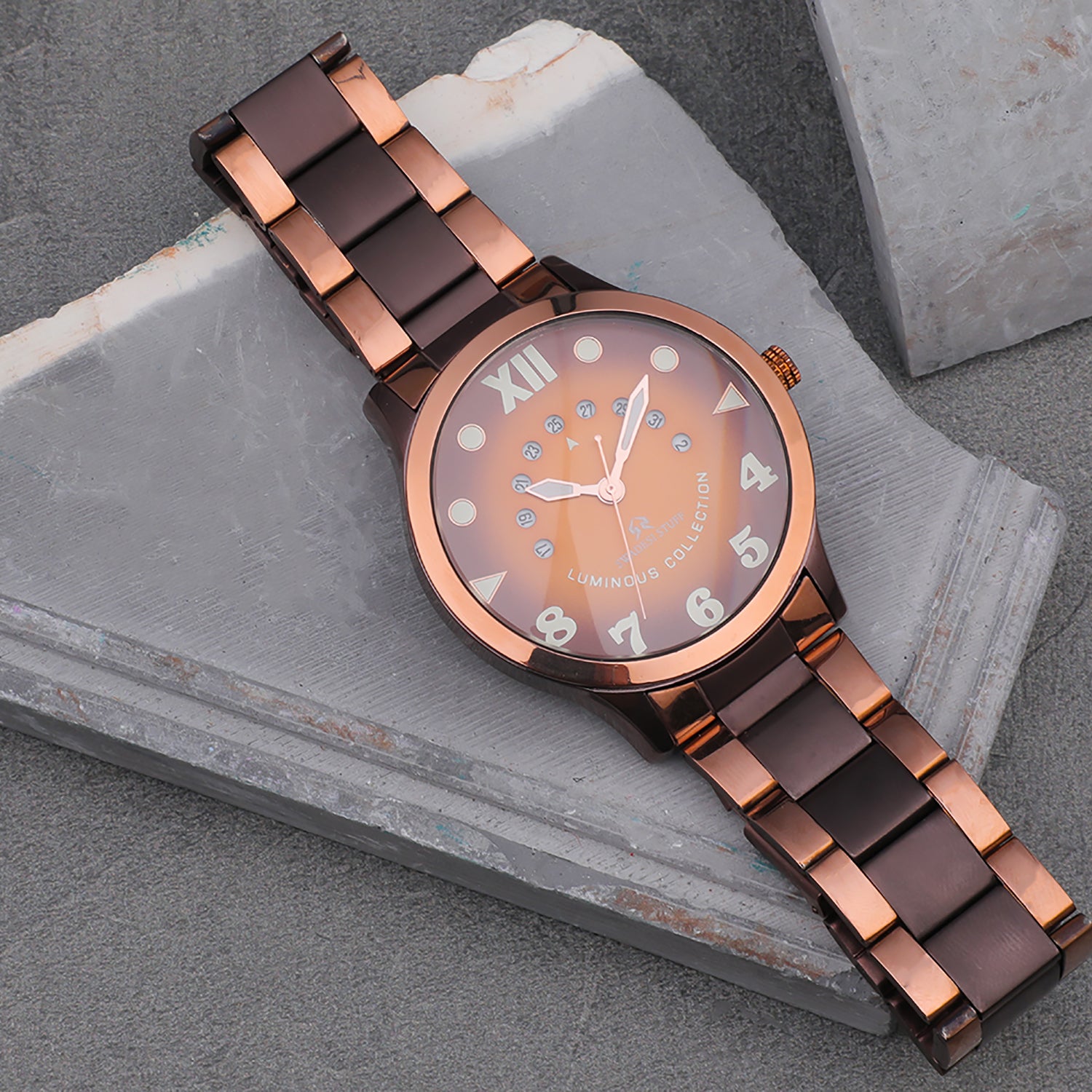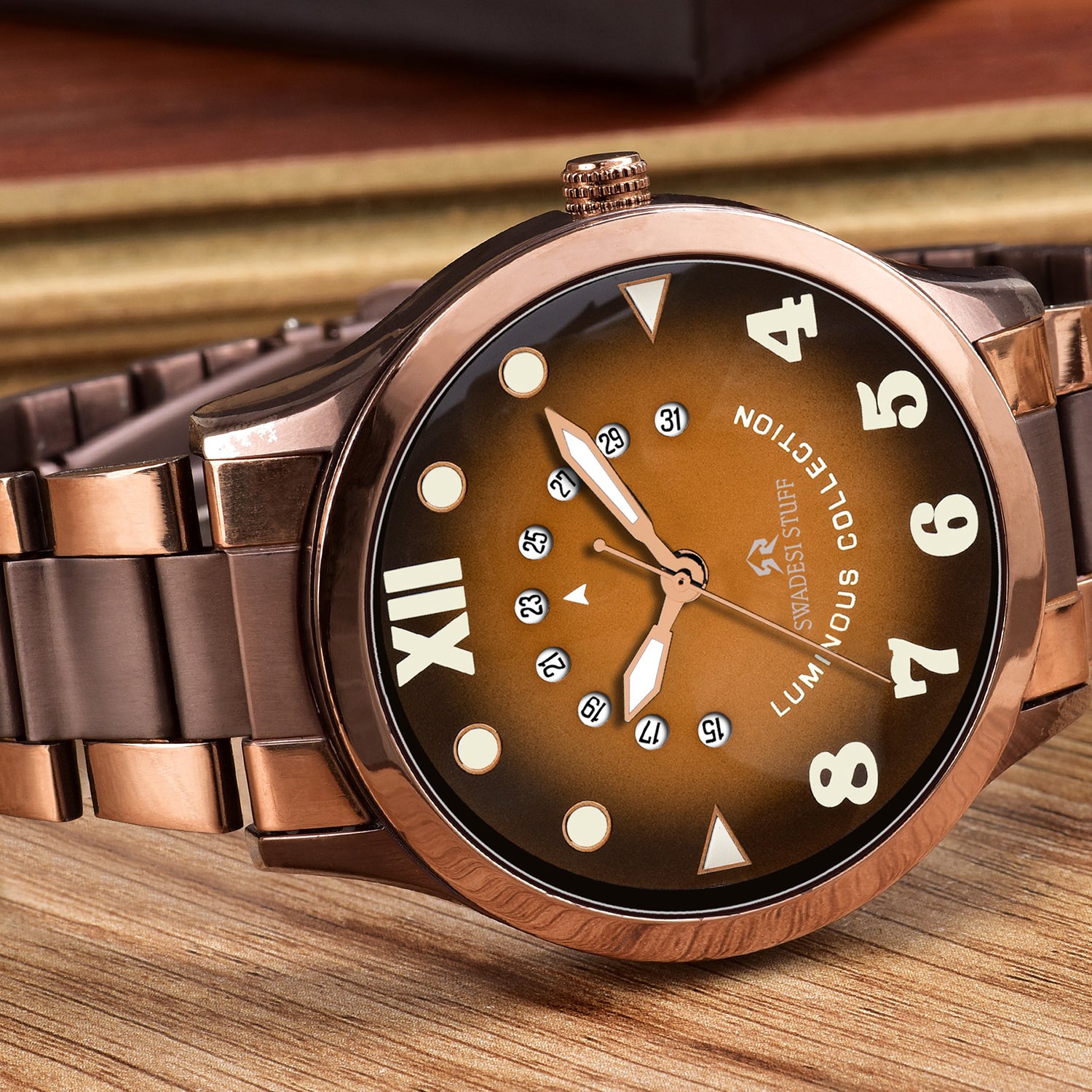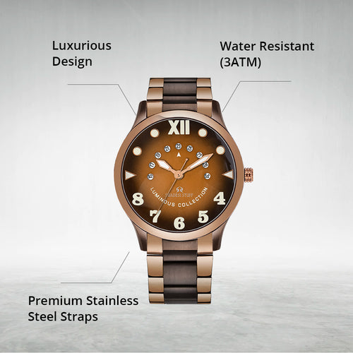 A luxurious watch with a round face & brown dial with bold hour markers and delicate hands.