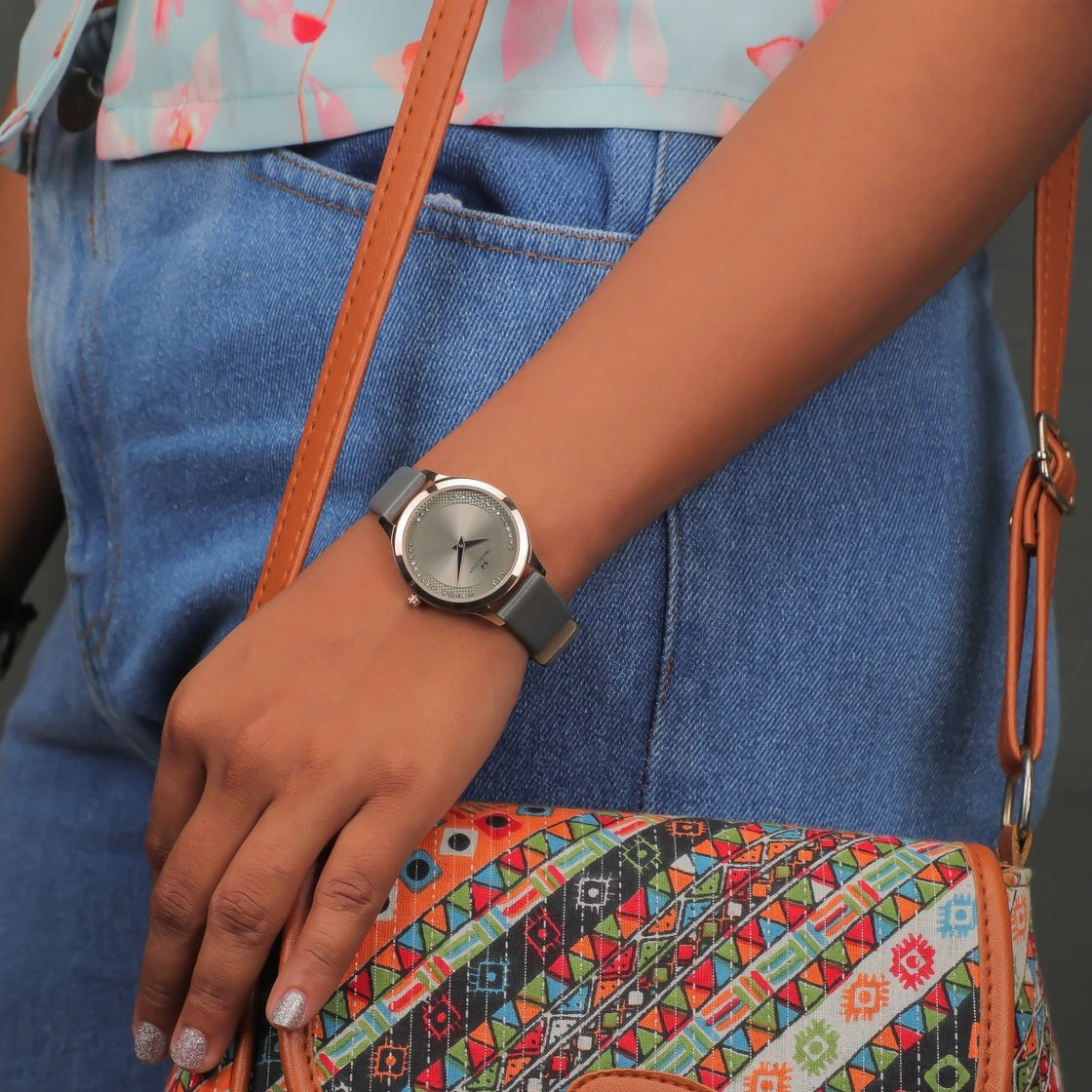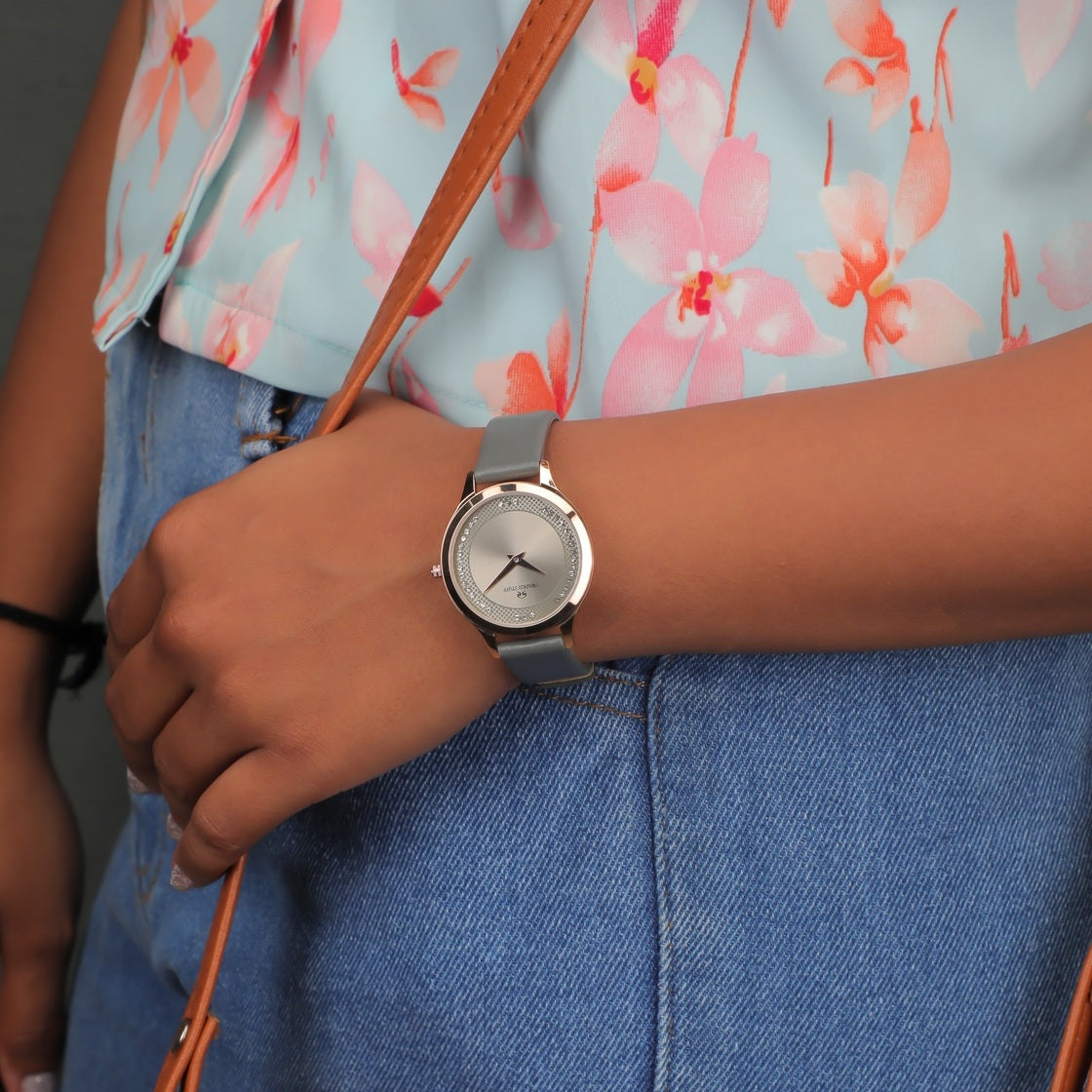 A luxurious watch with a round face & grey dial with golden hour markers and delicate hands.