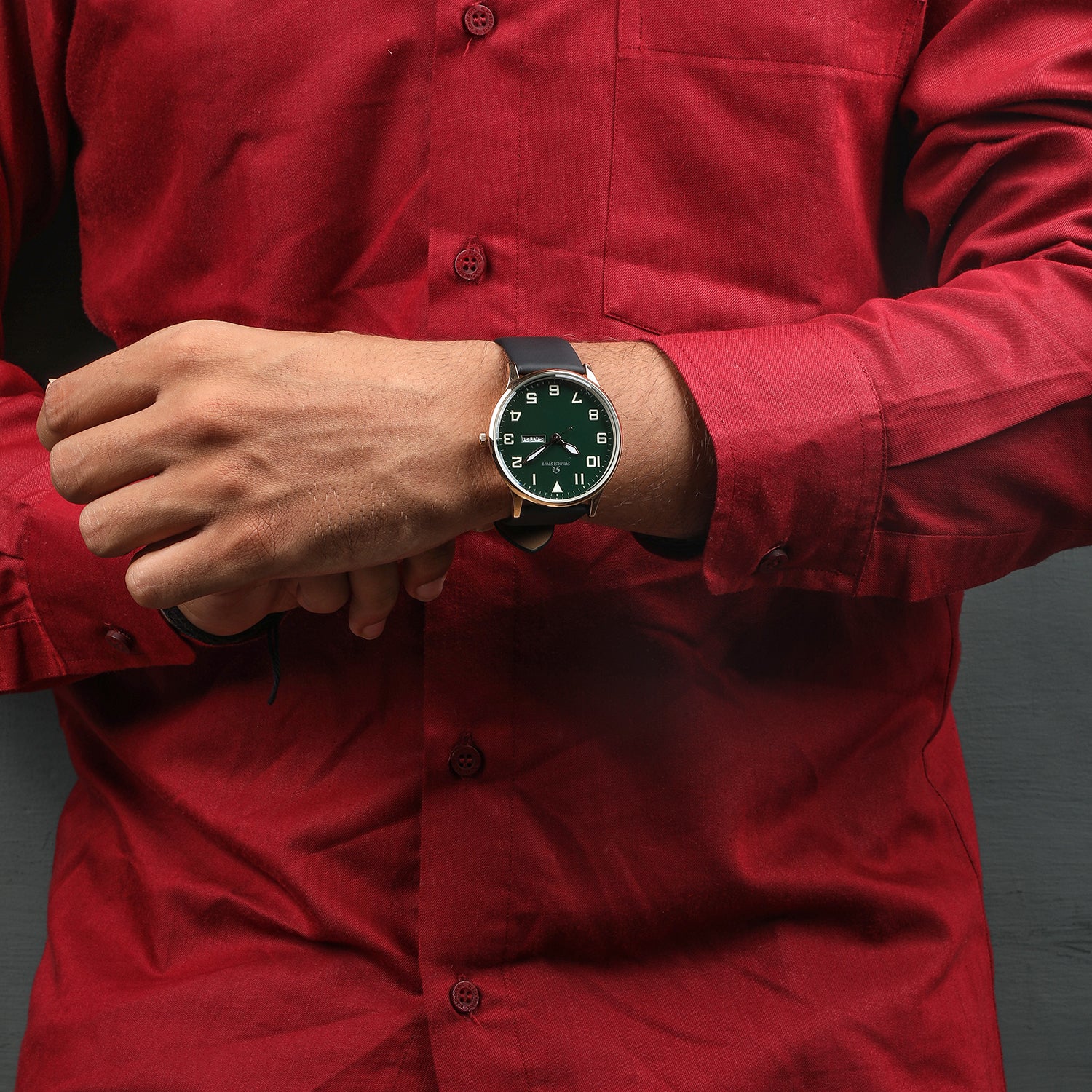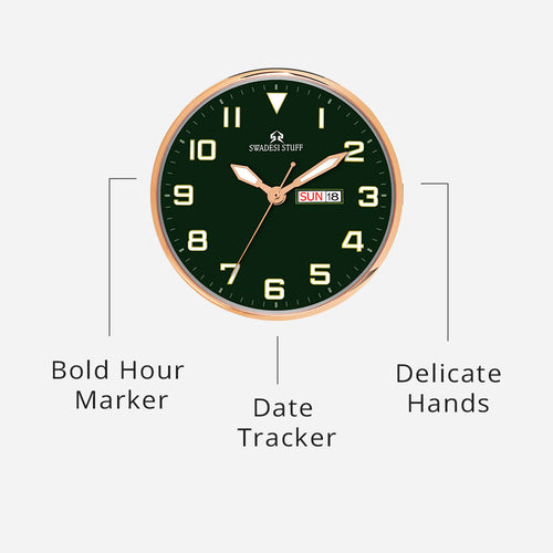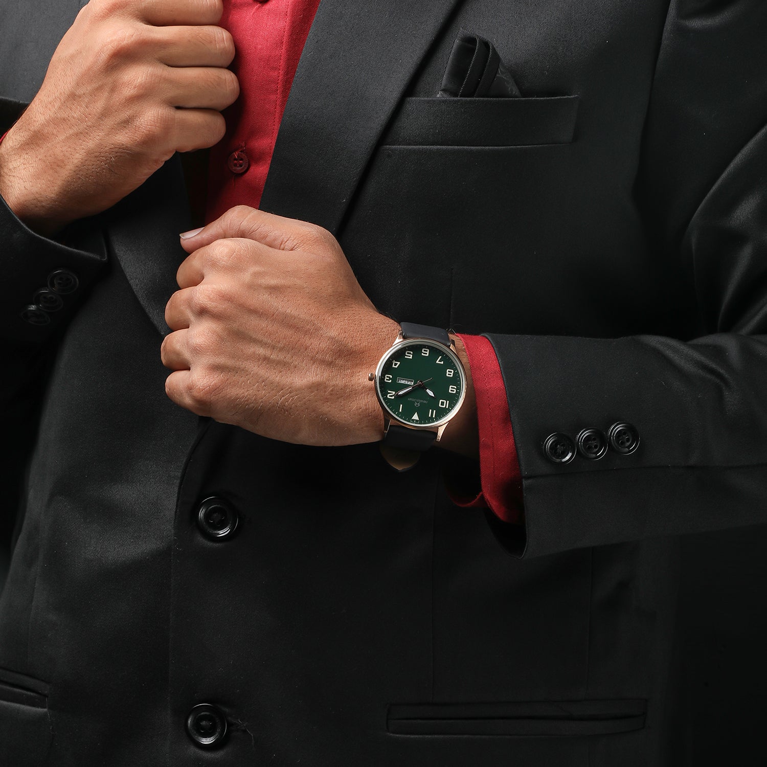 A luxurious watch with a round face & green dial with bold hour markers and delicate hands.