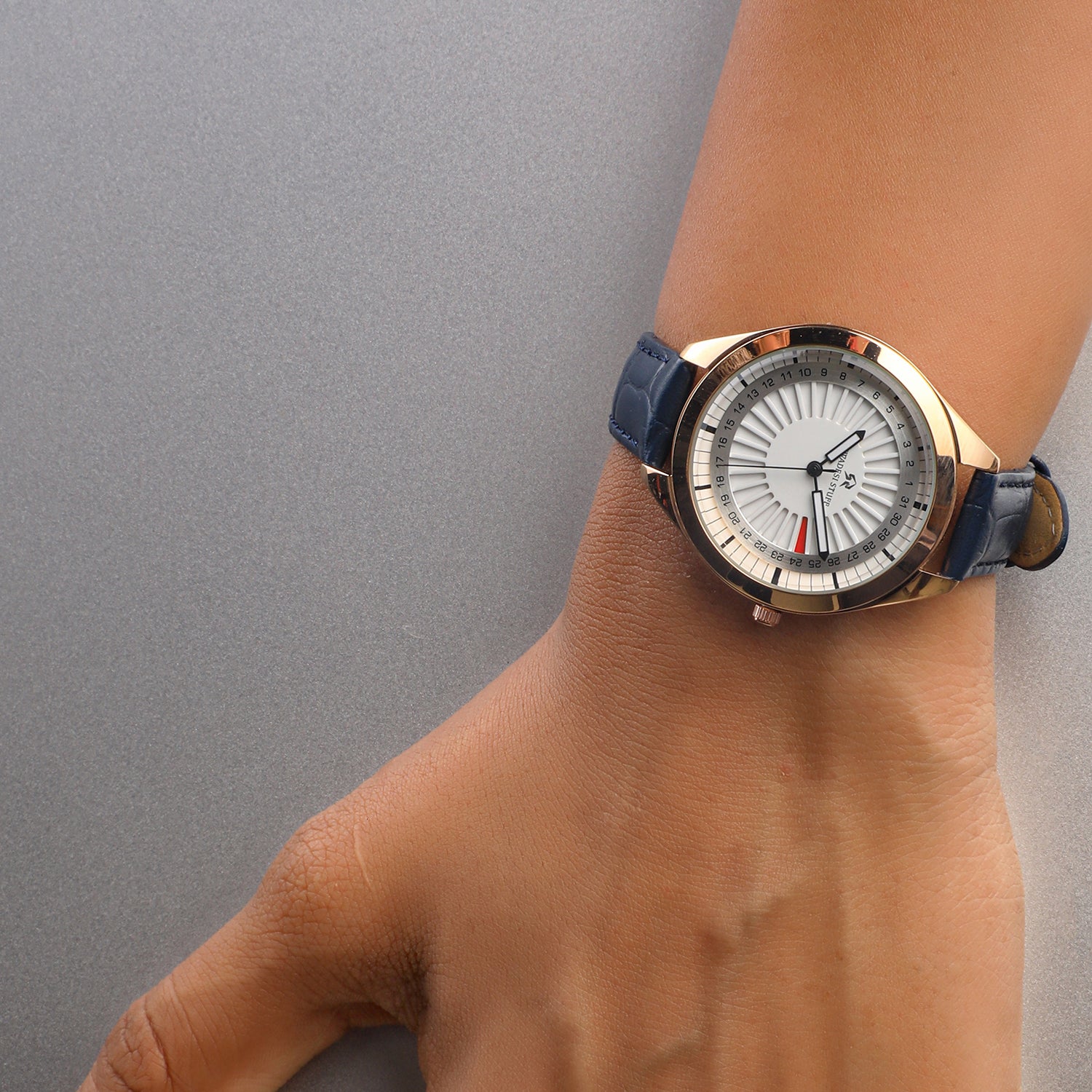 A luxurious watch with a round face & white dial with bold hour markers and delicate hands.