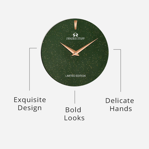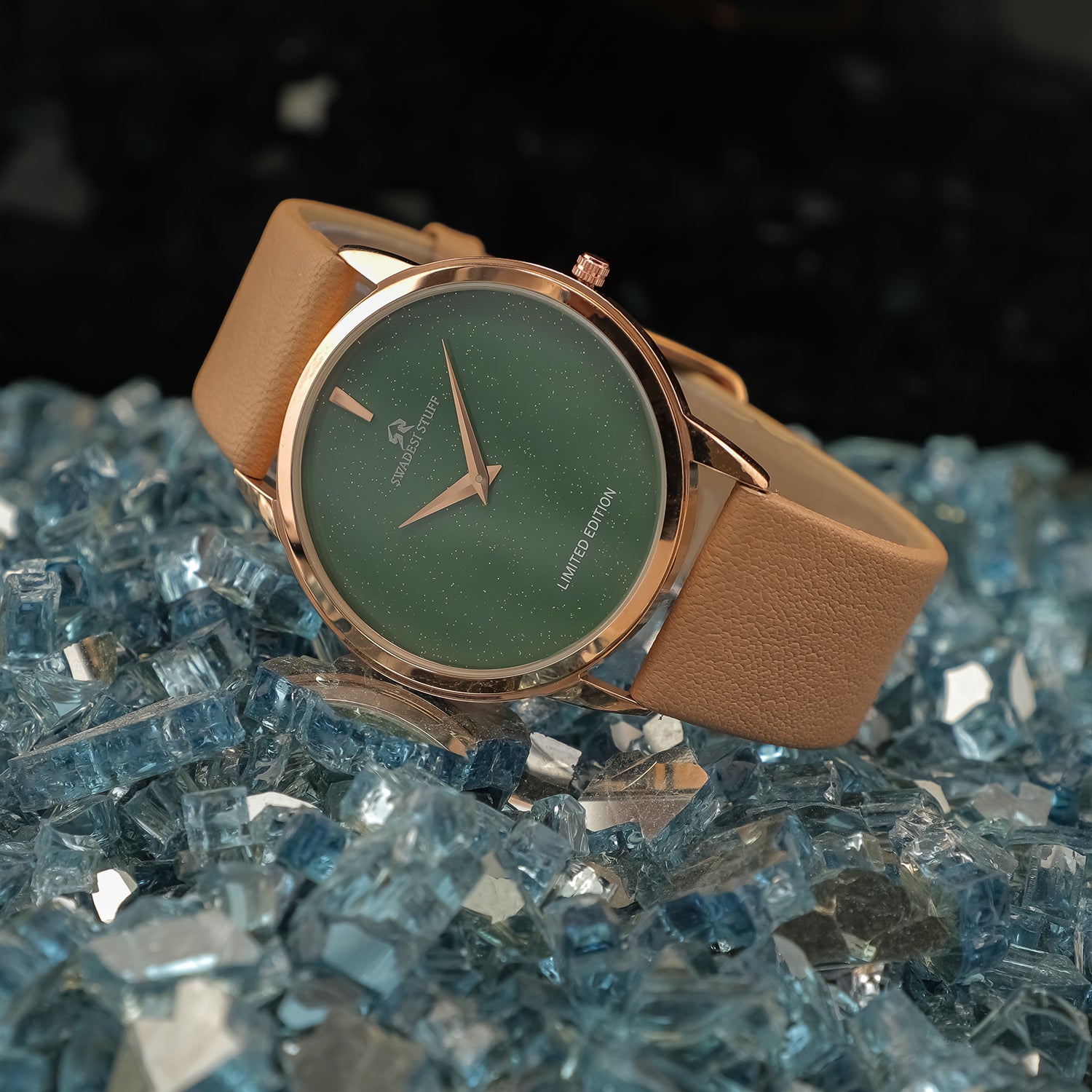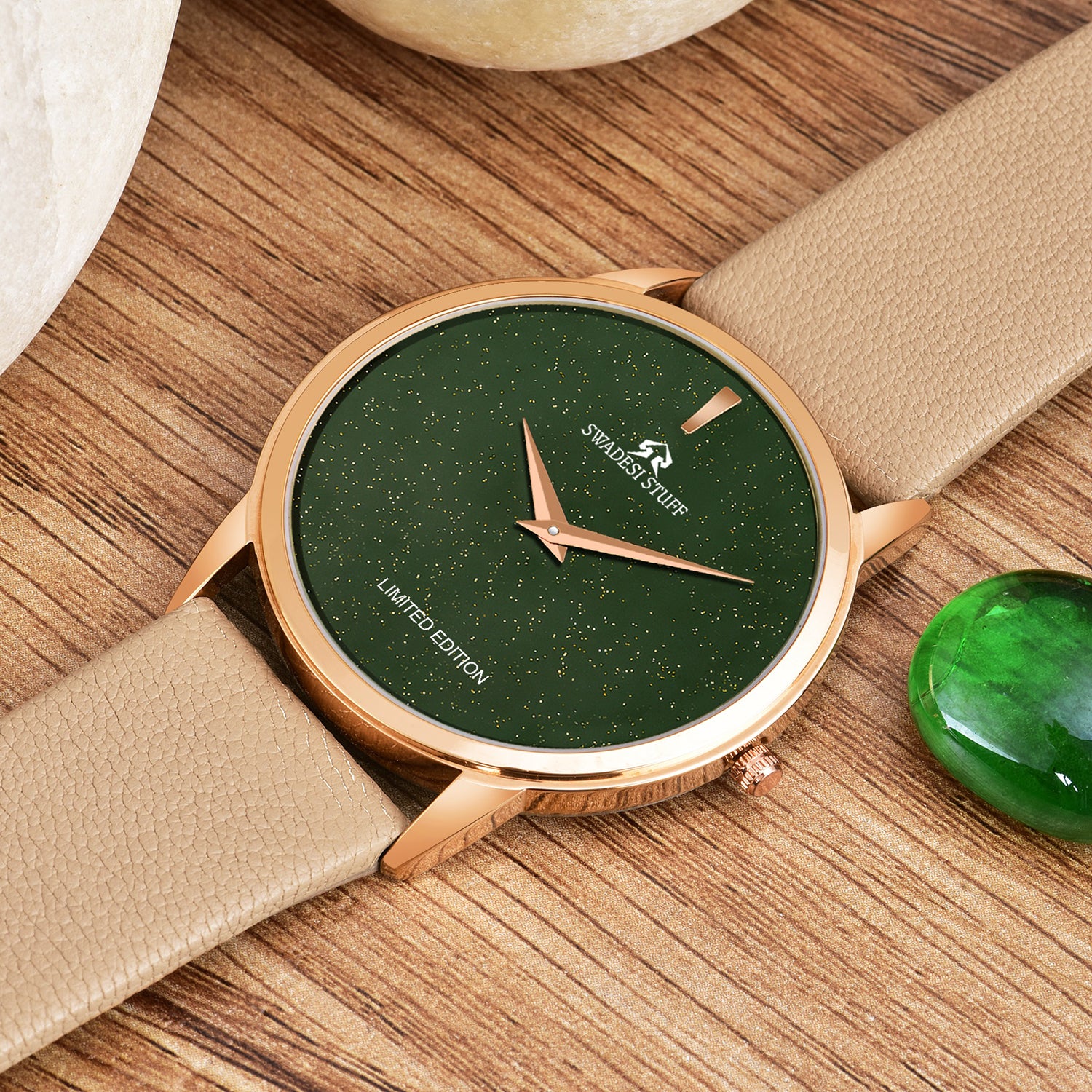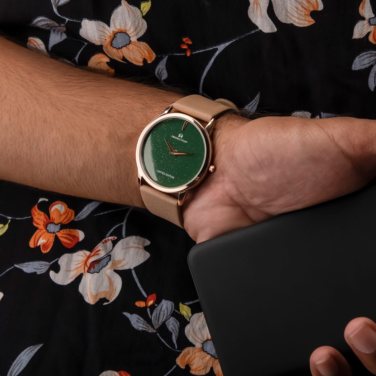 A luxurious watch with a round face & green dial with golden hour markers and delicate hands.