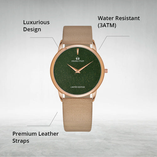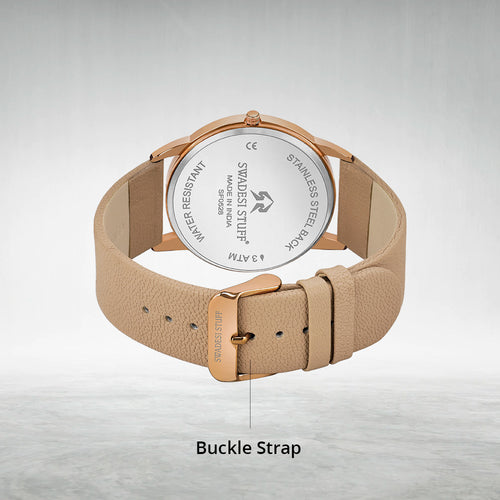 The timepiece is held by a pair of premium leather straps that are durable & super comfortable on the wrist