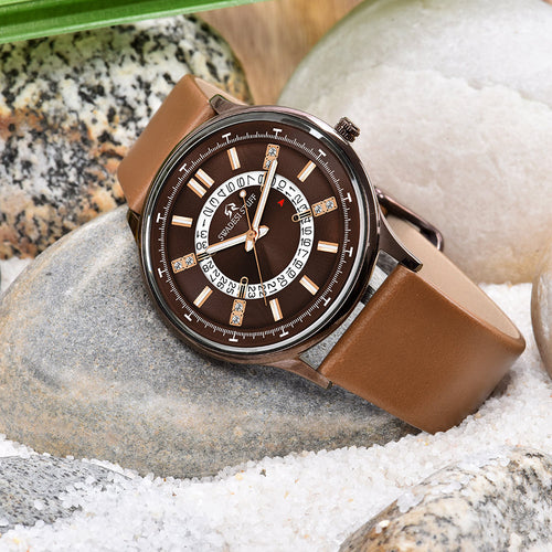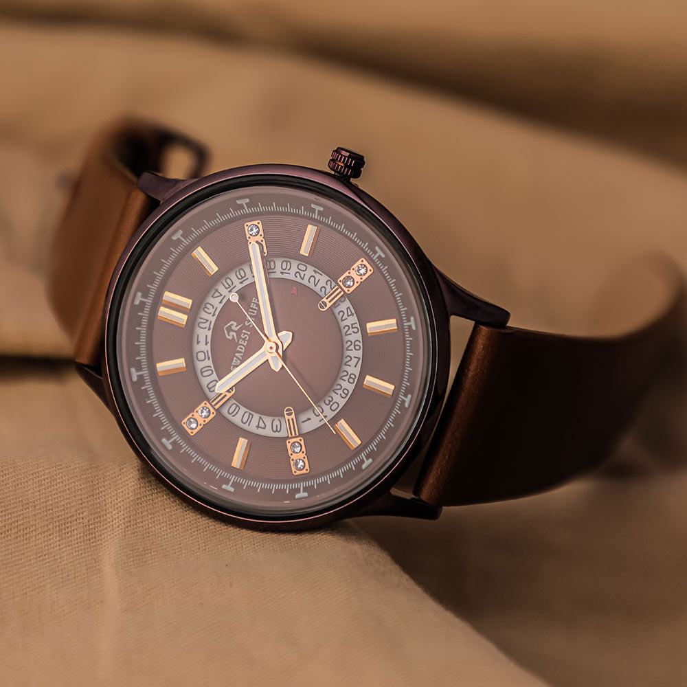 A luxurious diamond studded watch with a round face & dark brown dial with unique hour markers and delicate hands.