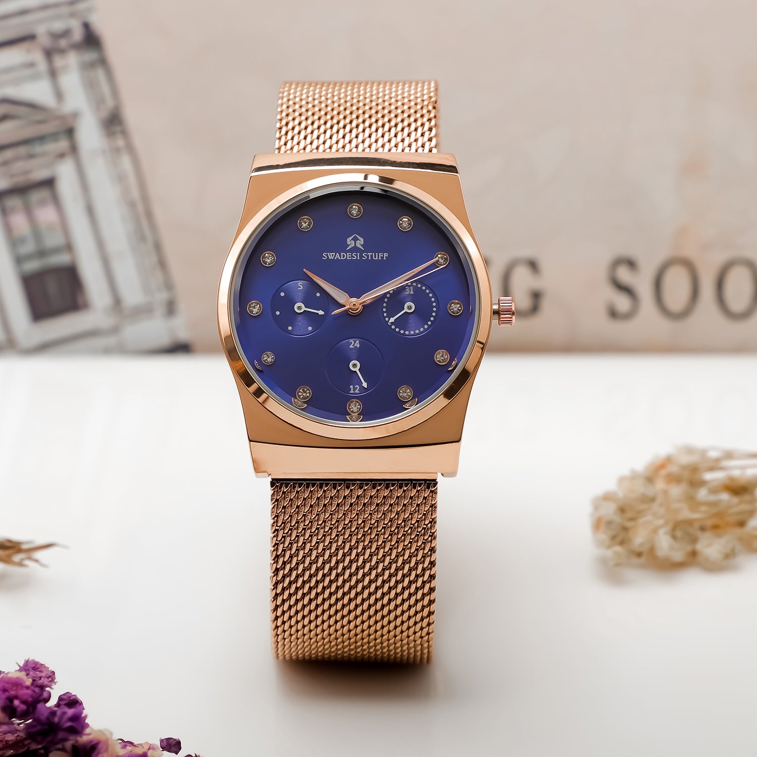 A luxurious watch with a round face & blue dial with bold hour markers and delicate hands.
