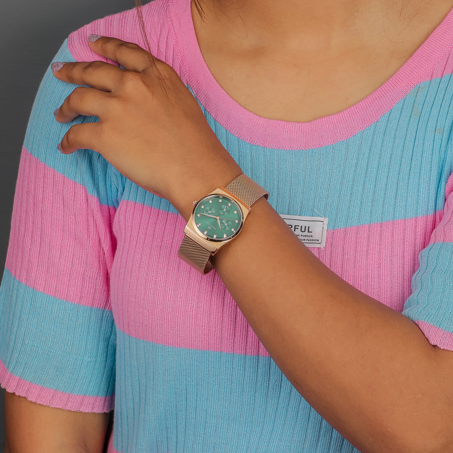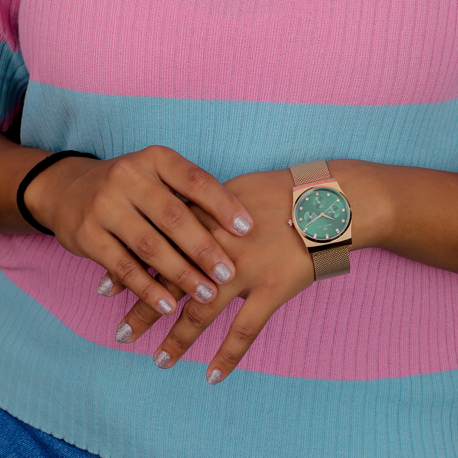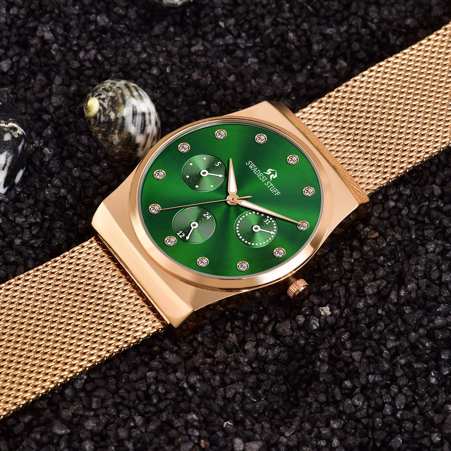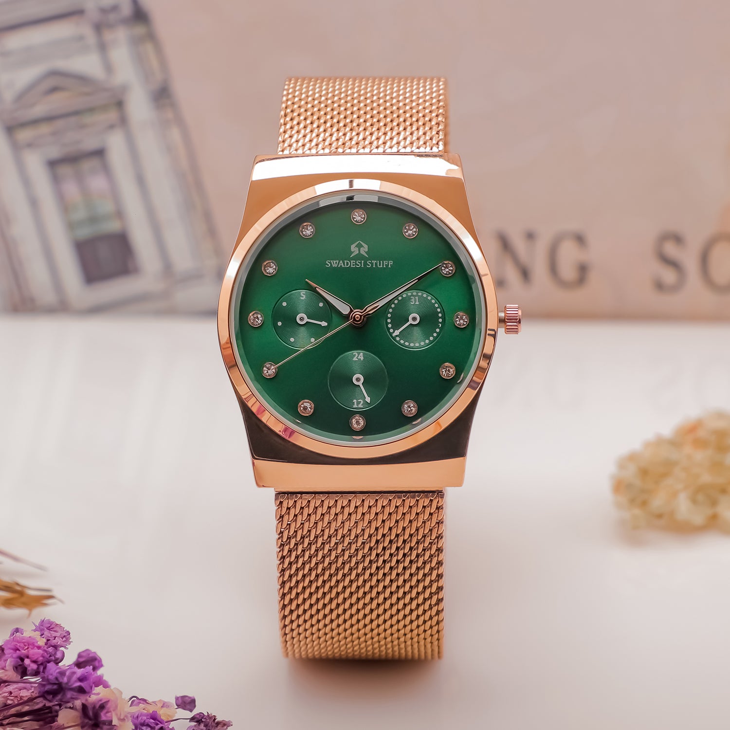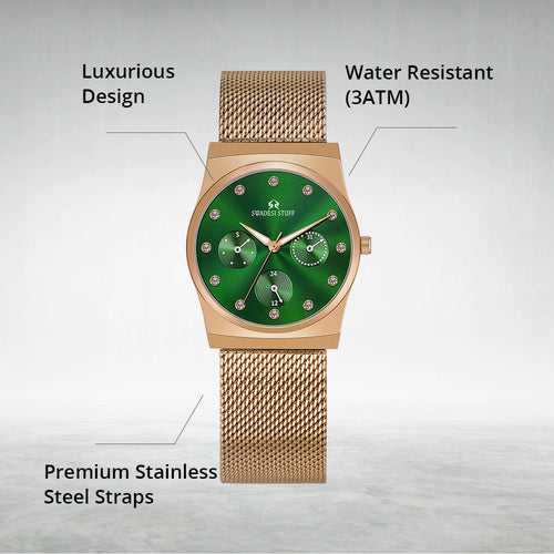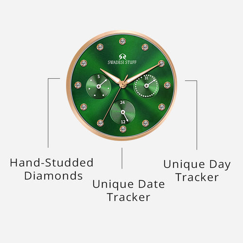 A luxurious watch with a round face & green dial with bold hour markers and delicate hands.